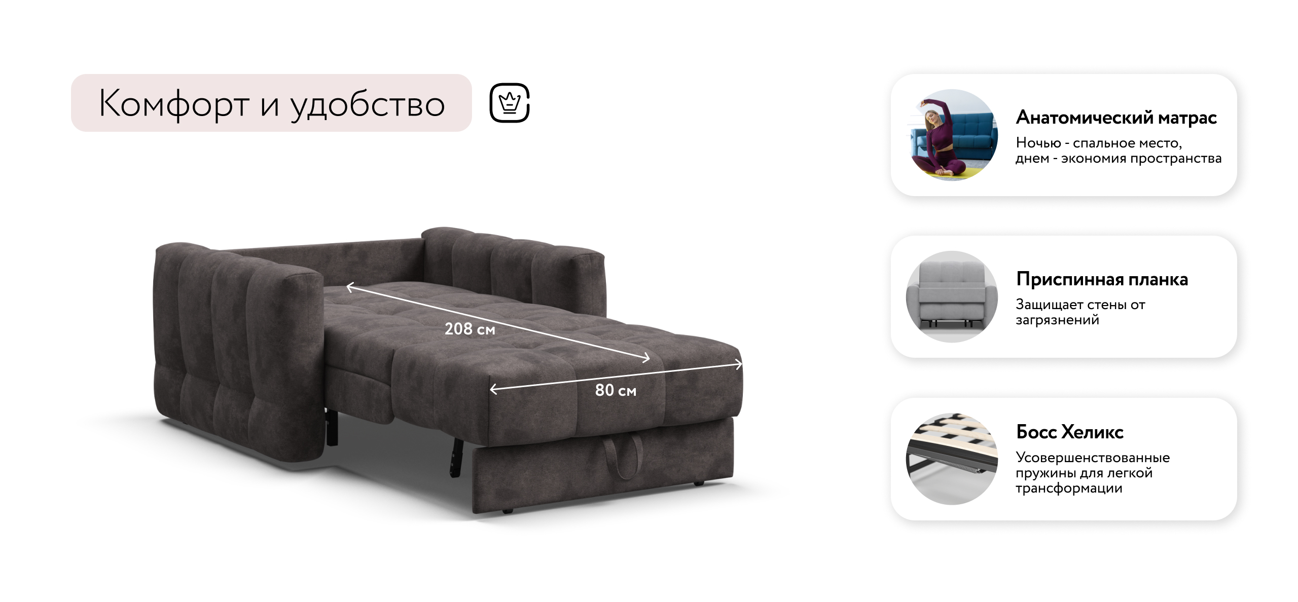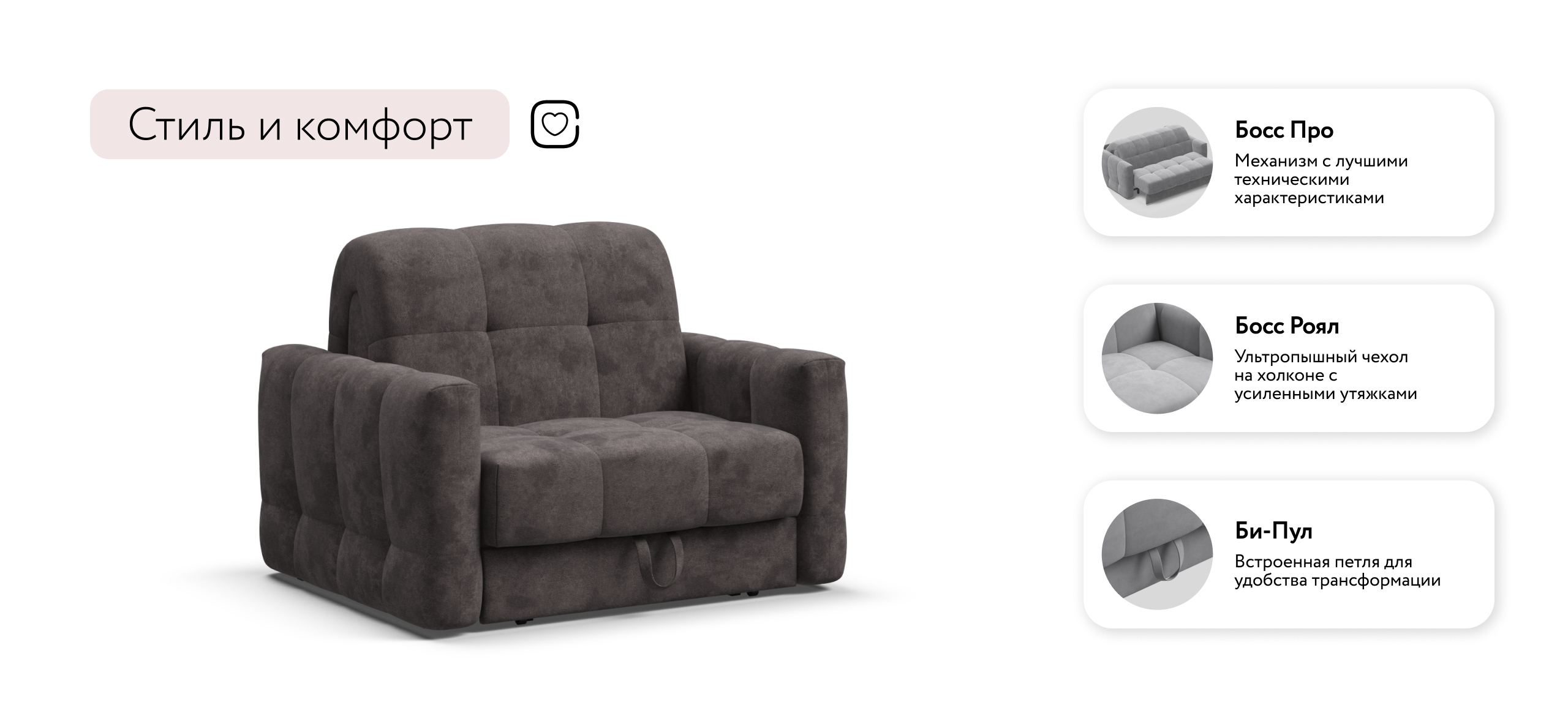 Благодаря прочному и надежному механизму аккордеон BOSS PRO, кресло-кровать прекрасно сочетает в себе две функции: комфортный отдых днем и полноценное дополнительное спальное место для гостя или ребенка ночью.
