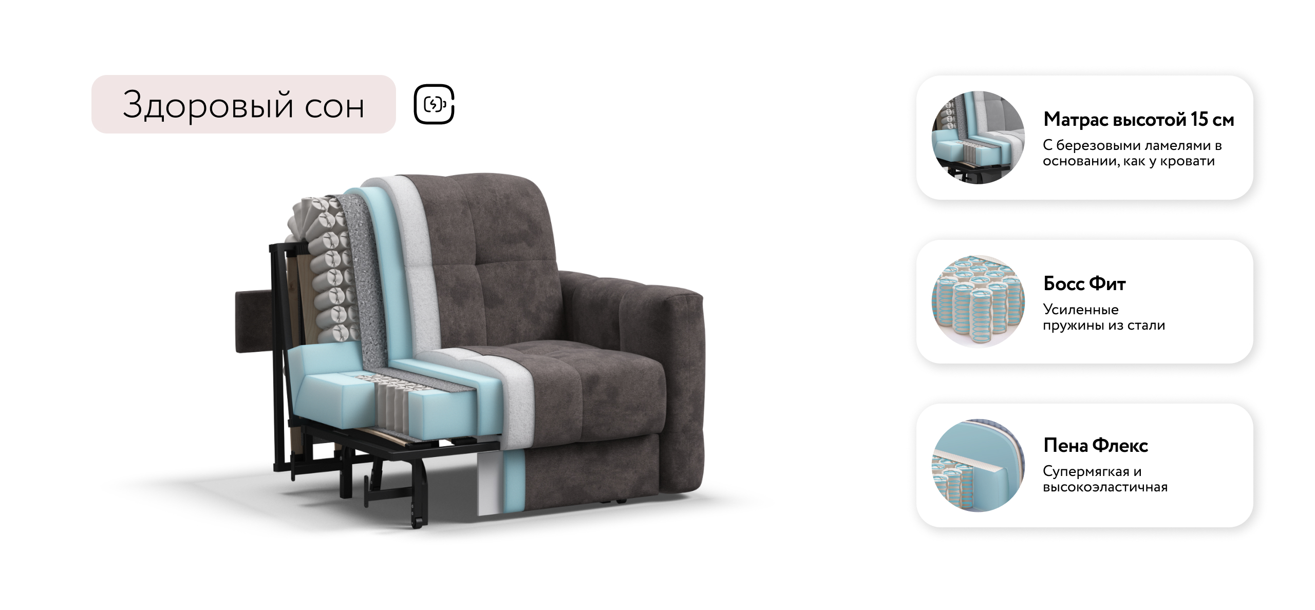 Инновационный анатомический матрас BOSS Quality в диване, высотой 15 см., выполнен из полноценного независимого пружинного блока BOSS FIT и высокоэластичной пены FLEX – гарантия здорового сна, как на кровати!