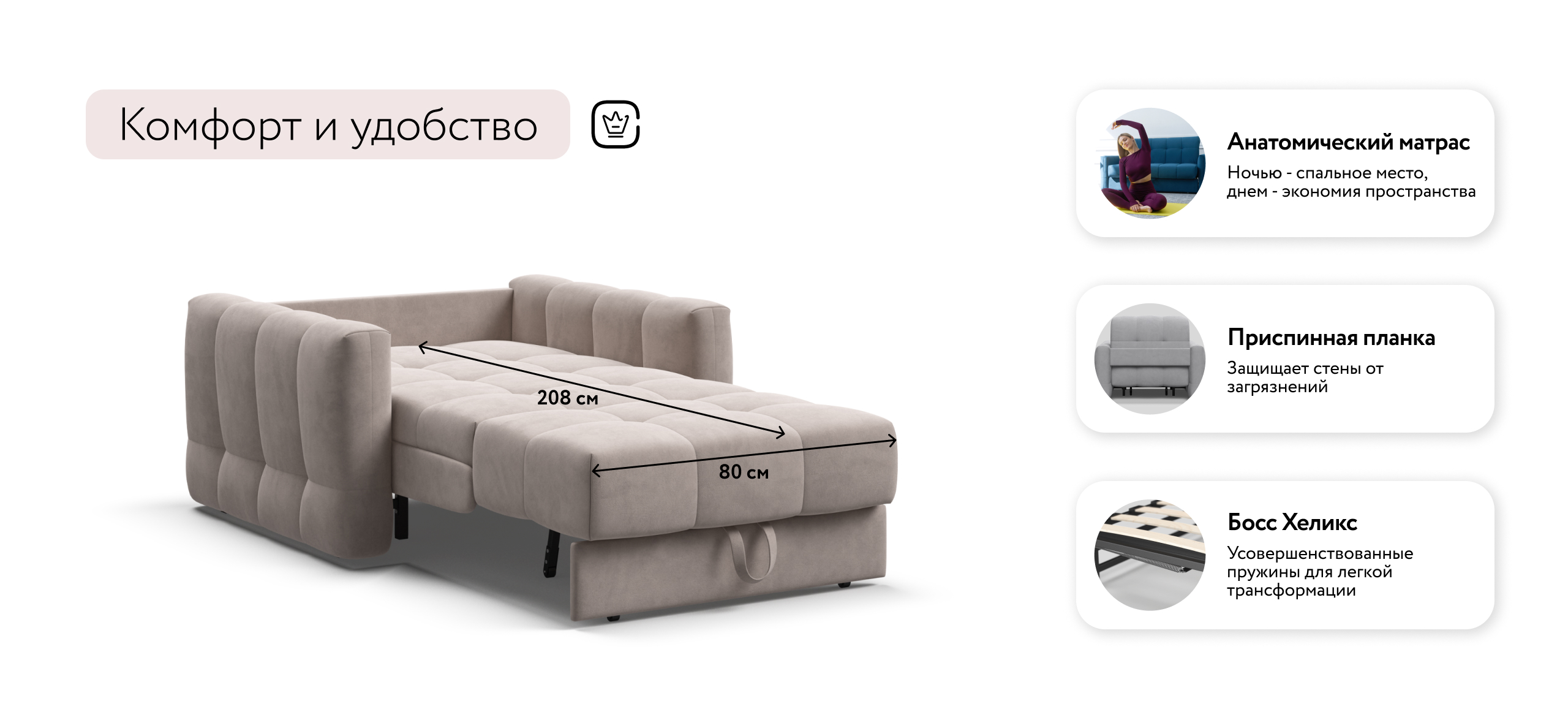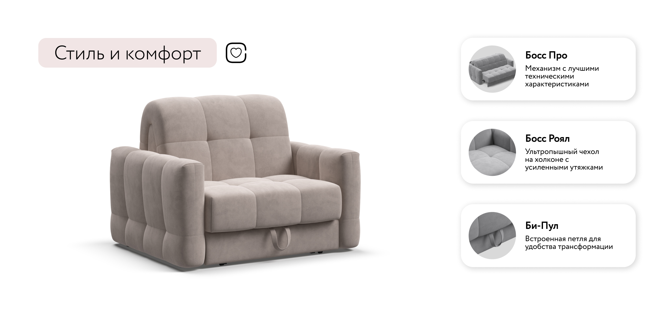Благодаря прочному и надежному механизму аккордеон BOSS PRO, кресло-кровать прекрасно сочетает в себе две функции: комфортный отдых днем и полноценное дополнительное спальное место для гостя или ребенка ночью.