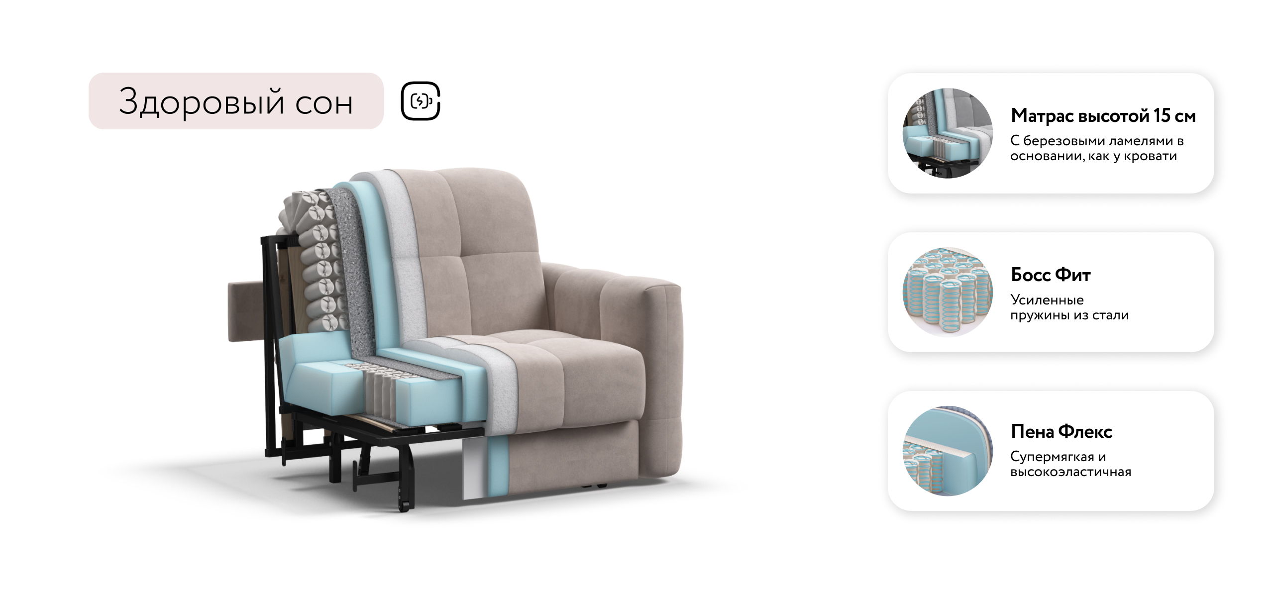 Инновационный анатомический матрас BOSS Quality в диване, высотой 15 см., выполнен из полноценного независимого пружинного блока BOSS FIT и высокоэластичной пены FLEX – гарантия здорового сна, как на кровати!