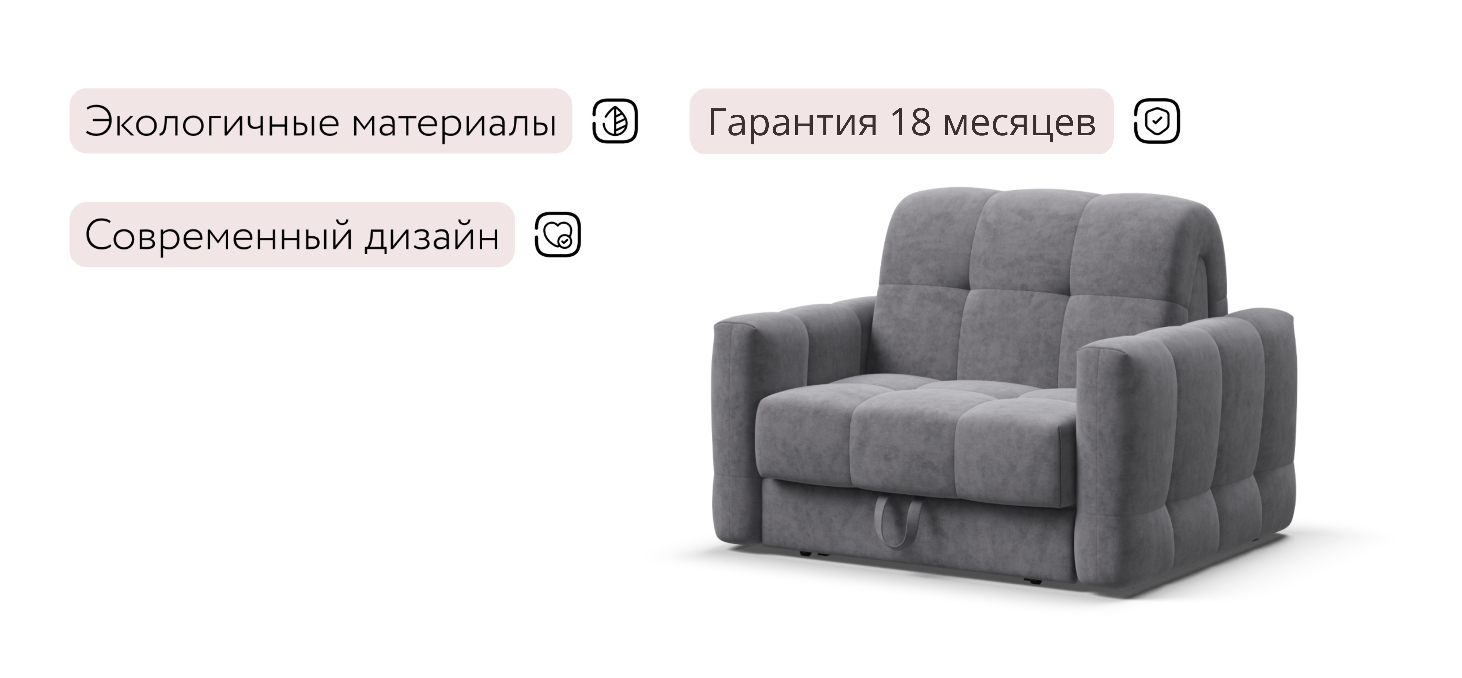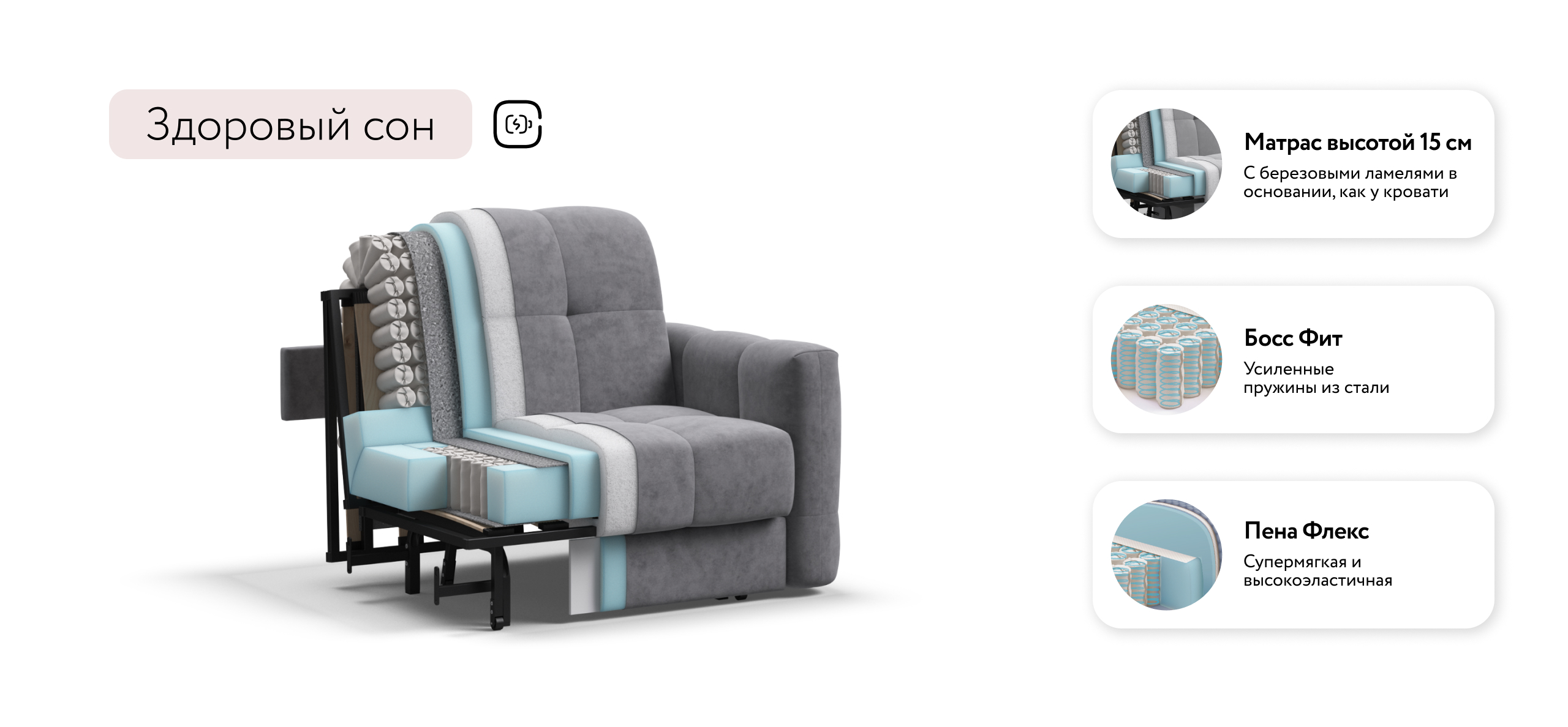 Благодаря прочному и надежному механизму аккордеон BOSS PRO, кресло-кровать прекрасно сочетает в себе две функции: комфортный отдых днем и полноценное дополнительное спальное место для гостя или ребенка ночью.