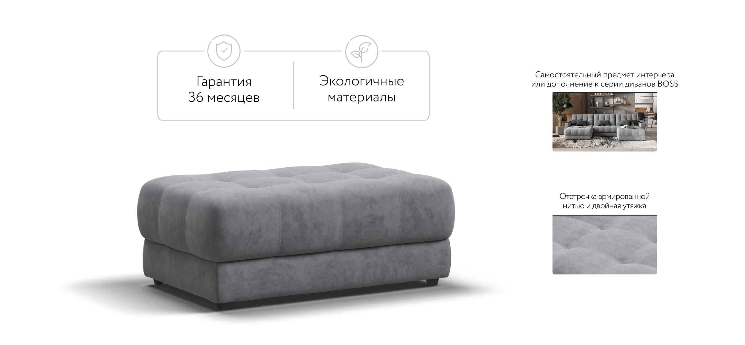 Пуф BOSS - cамостоятельный предмет интерьера или дополнительное посадочное место к любому дивану BOSS. В основании пуфа усиленные пружины BOSS FIT из прочной антикоррозионной стали, а так же пена BOSS FLEX (мягче обычной в 2 раза) = супер комфортный отдых!
