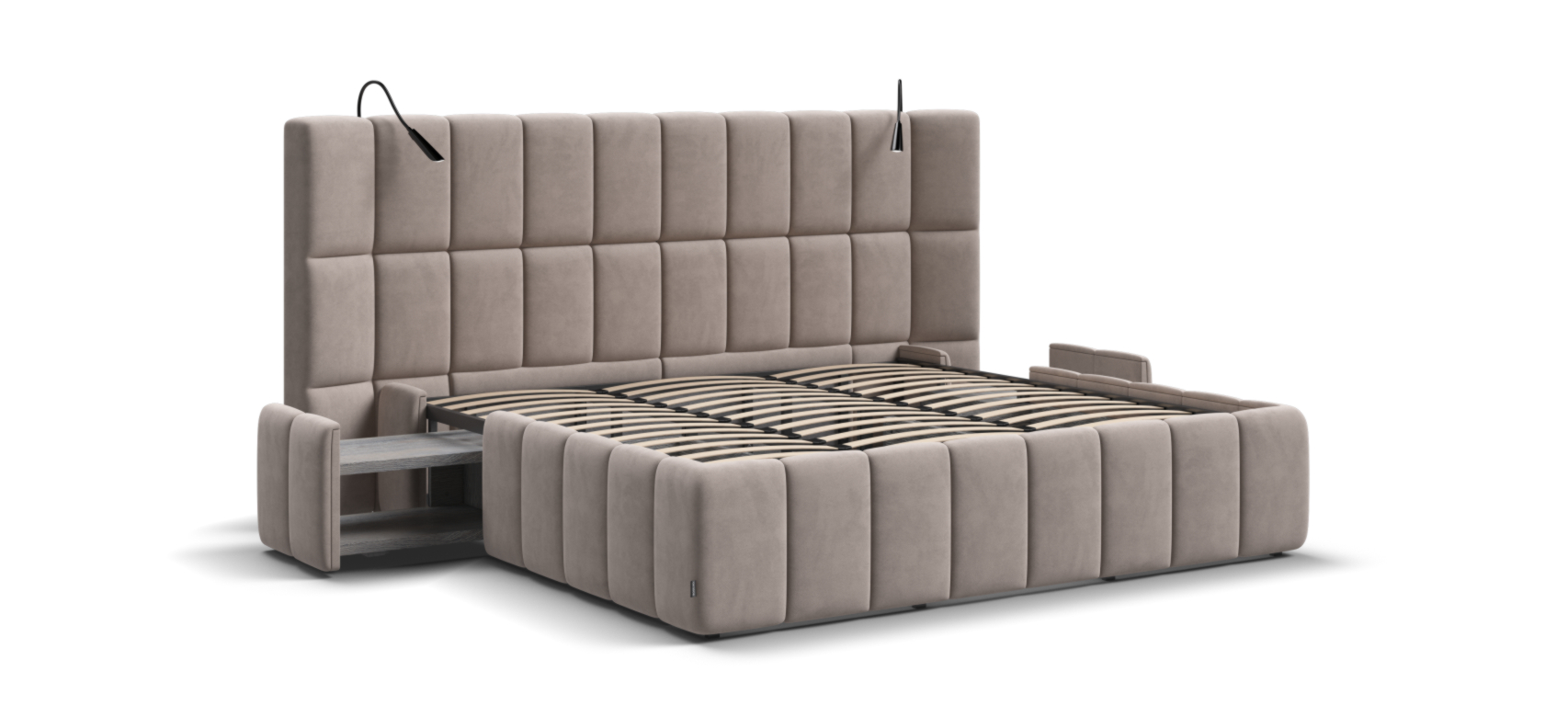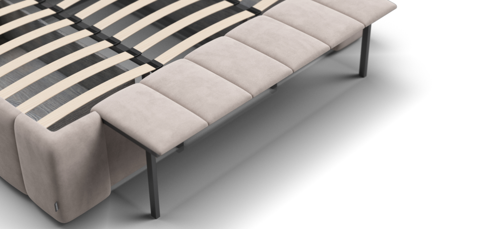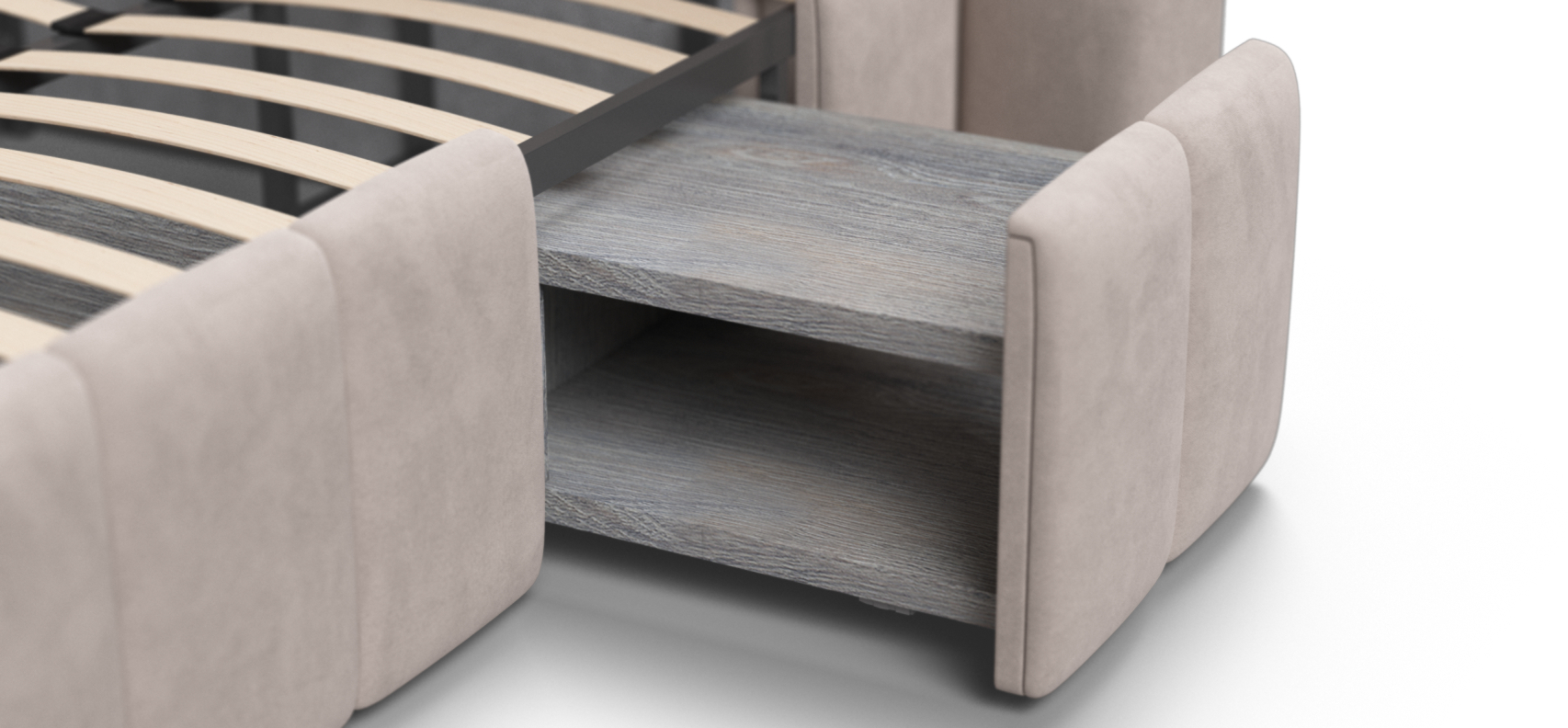 Каждая деталь очень качественно изготовлена. При сборке обратили внимание что в целом кровать очень продуманна, например при выдвижении тумбы, ящиков и банкетки не образуется пустое пространство куда например могут залезть домашние питомцы, все эти зоны продуманы перегородками.