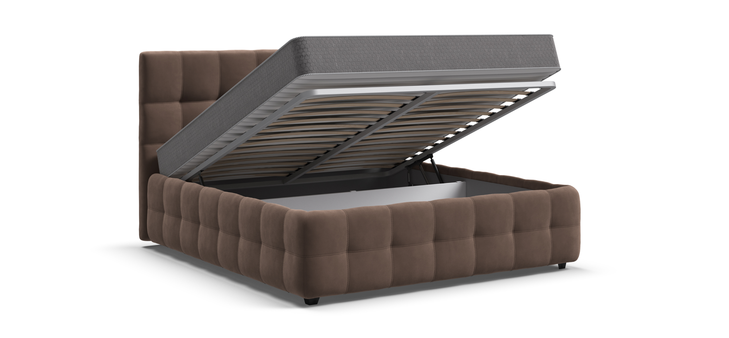 Особое внимание заслуживают газовые лифты SpaceLift, изготовленные из авиационного алюминия. Они обеспечивают лёгкое и плавное поднятие матраса, что делает доступ к отсеку для хранения быстрым и удобным. Дизайн 360 предполагает, что задняя часть спинки кровати также выполнена из основной ткани, что позволяет размещать кровать не только у стены, но и в центре комнаты, сохраняя при этом её эстетическую привлекательность.