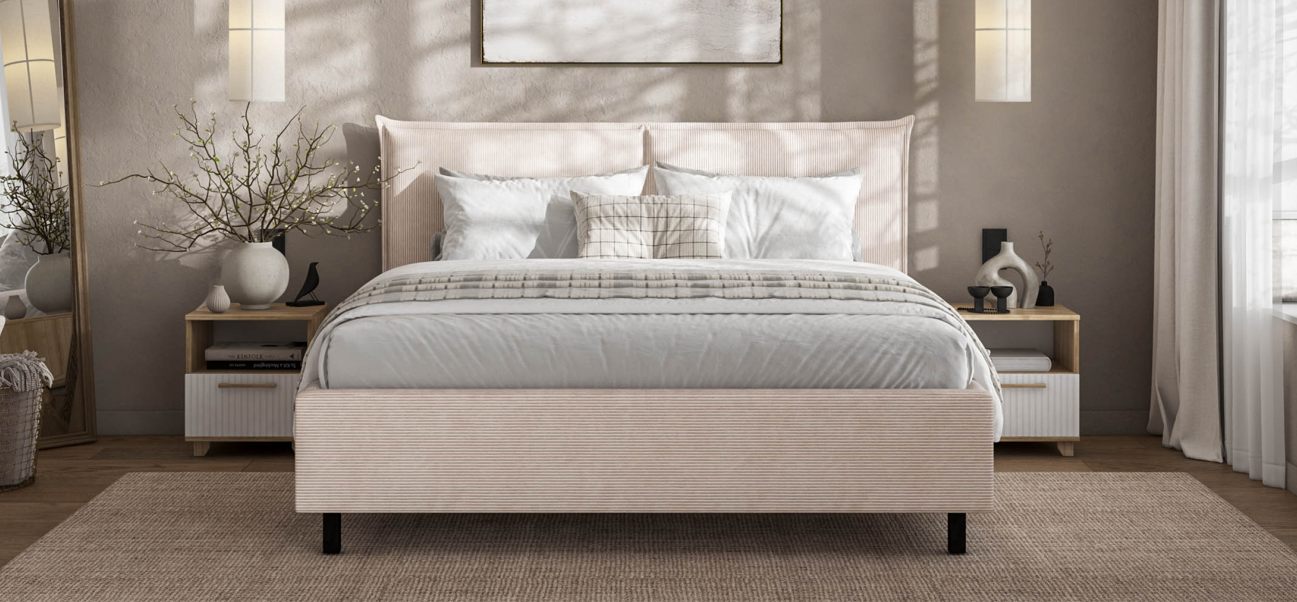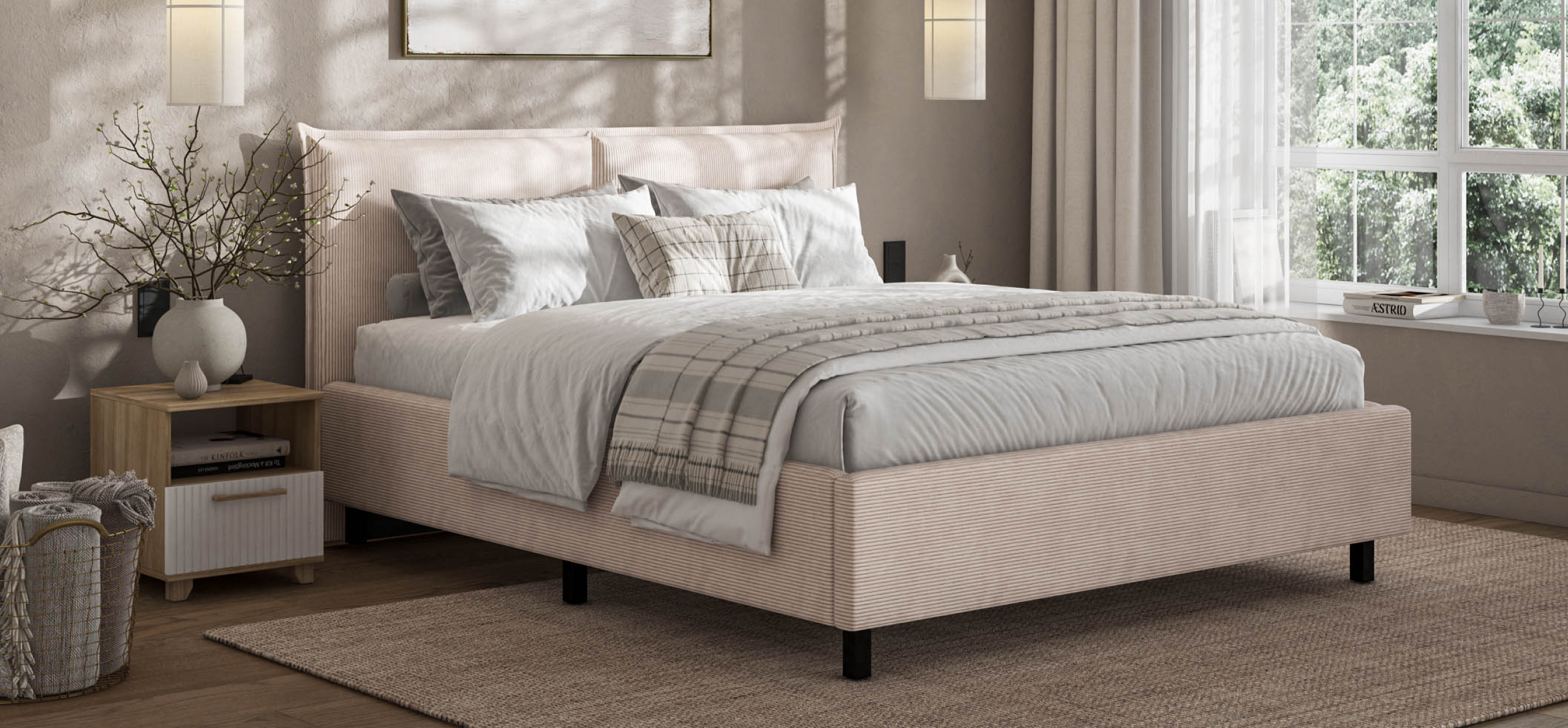 Мягкое изголовье и изысканный текстиль. Обивка из ультрамягкого вельвета CORD с бархатистой структурой создаёт уют и комфорт. Оптимальная ширина рубчика придаёт ткани стильный и современный вид, дополняя интерьер и делая отдых перед сном особенно приятным.