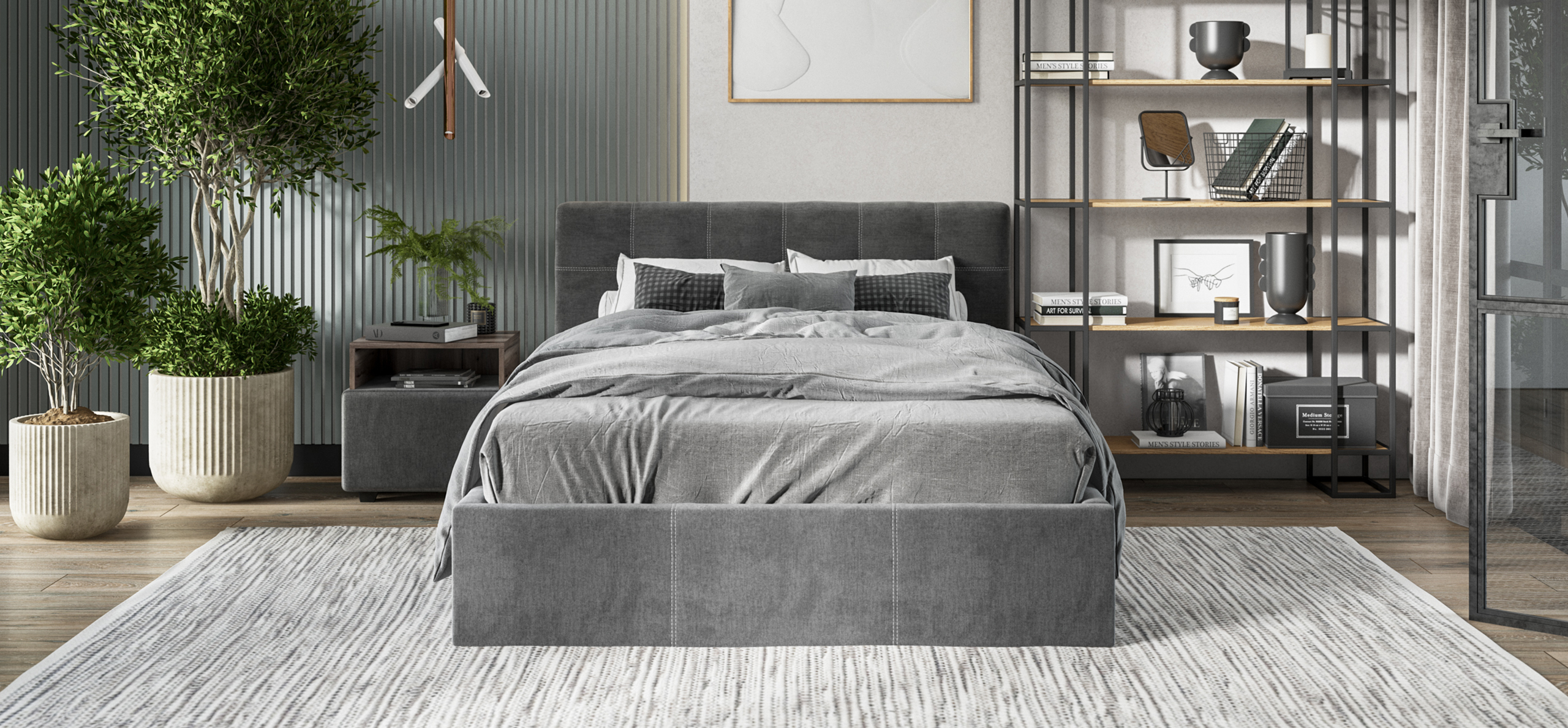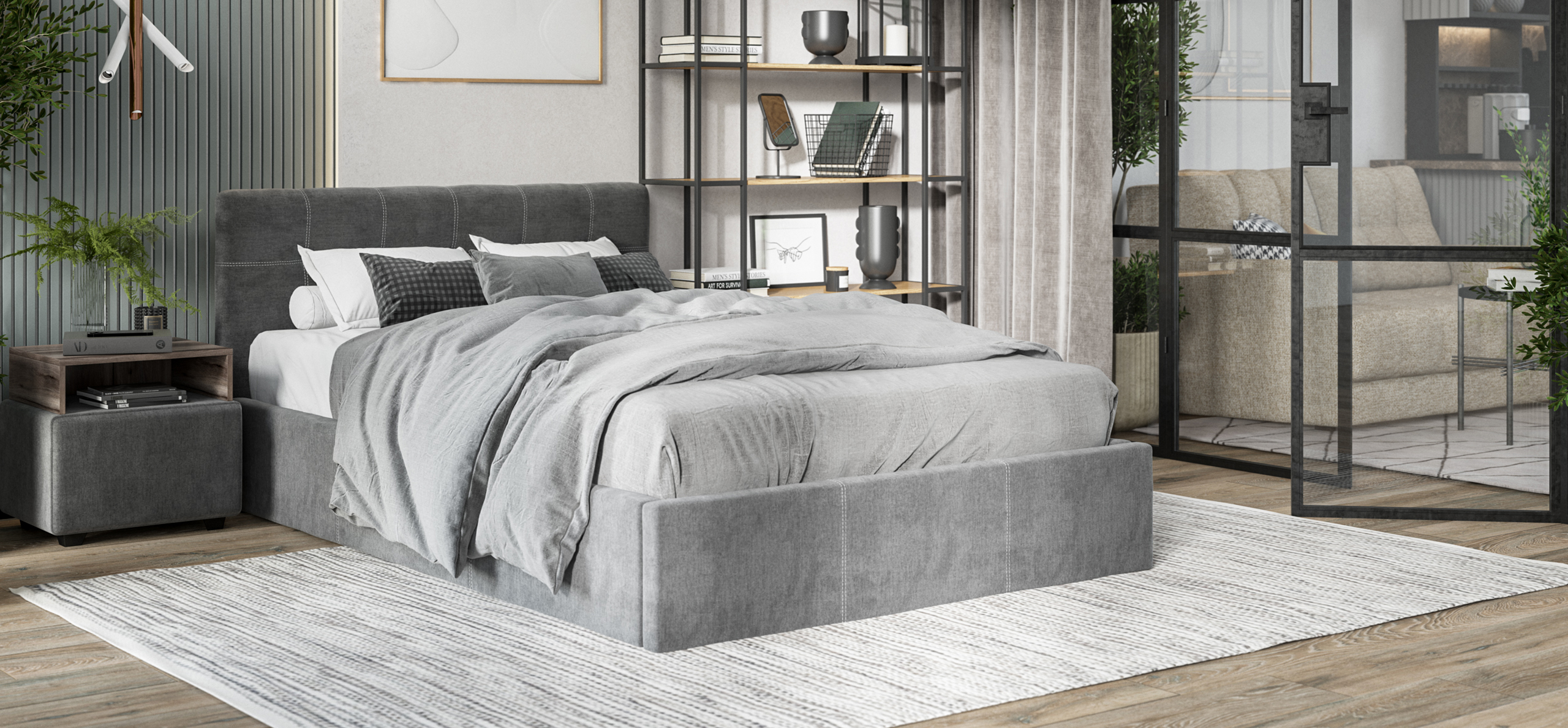 Кровать расположена на уровне пола, что предотвращает накопление пыли под основанием, облегчая уборку и поддерживая гигиену в спальне.