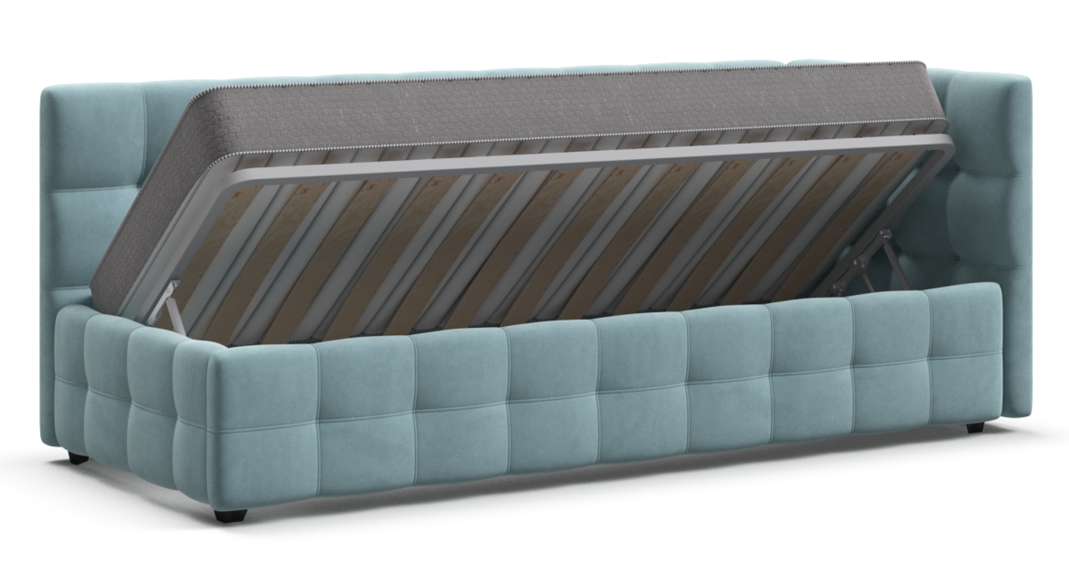 Кровать оснащена вместительным отсеком для хранения HideBox объемом 480 литров. Это позволяет удобно хранить постельное белье, игрушки или другие вещи, освобождая пространство в комнате и поддерживая порядок.