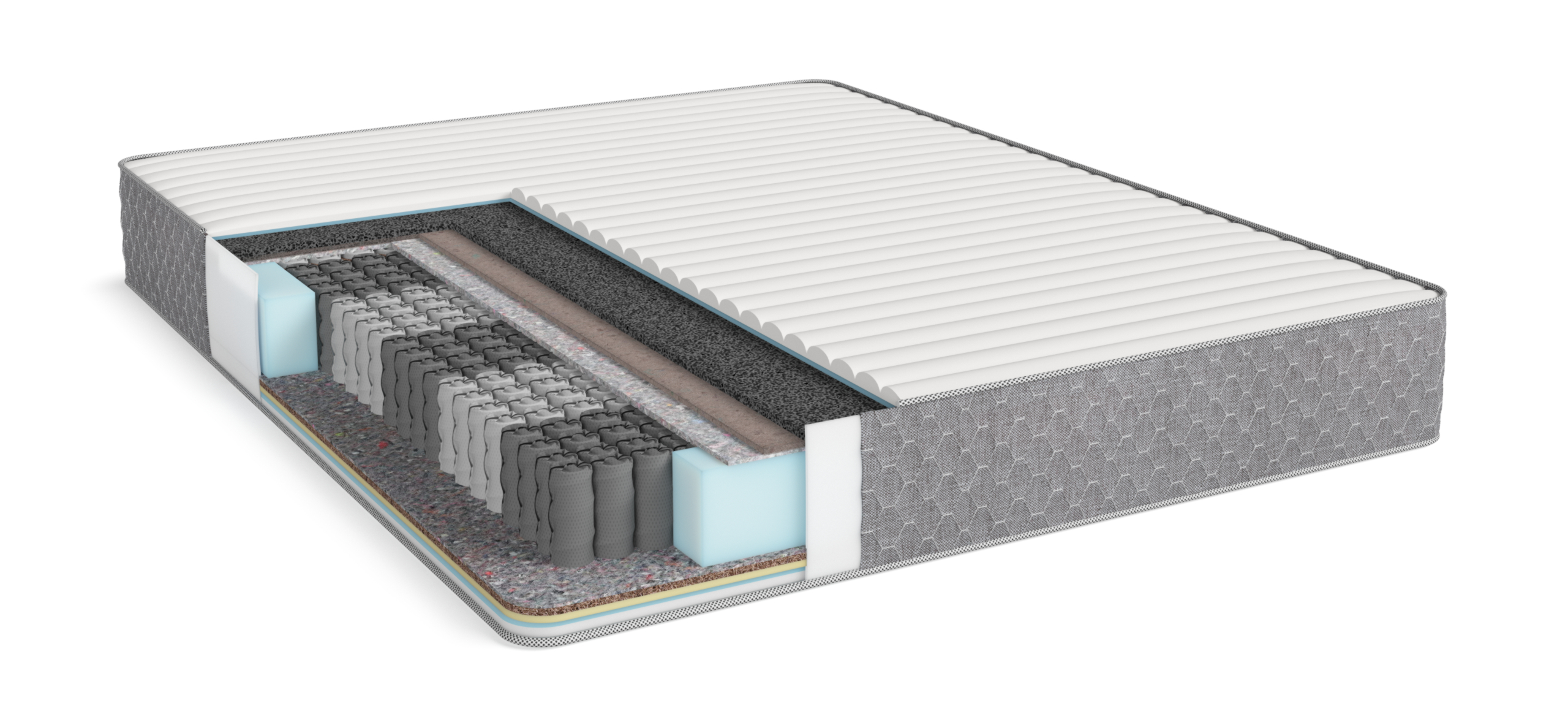 В основе матраса находится пружинный блок COMFY SPRING 850 дающий 8 зональную анатомическую поддержки для людей ведущих активный образ жизни: голова, шейный отдел, две зоны поддержки грудного отдела, поясничный отдел, крестец, бедра и ноги. В зависимости от веса используются ряды пружин разной жесткости, что позволяет создать незаметный перепад упругости, способствующий более эффективному расслаблению разных частей тела.