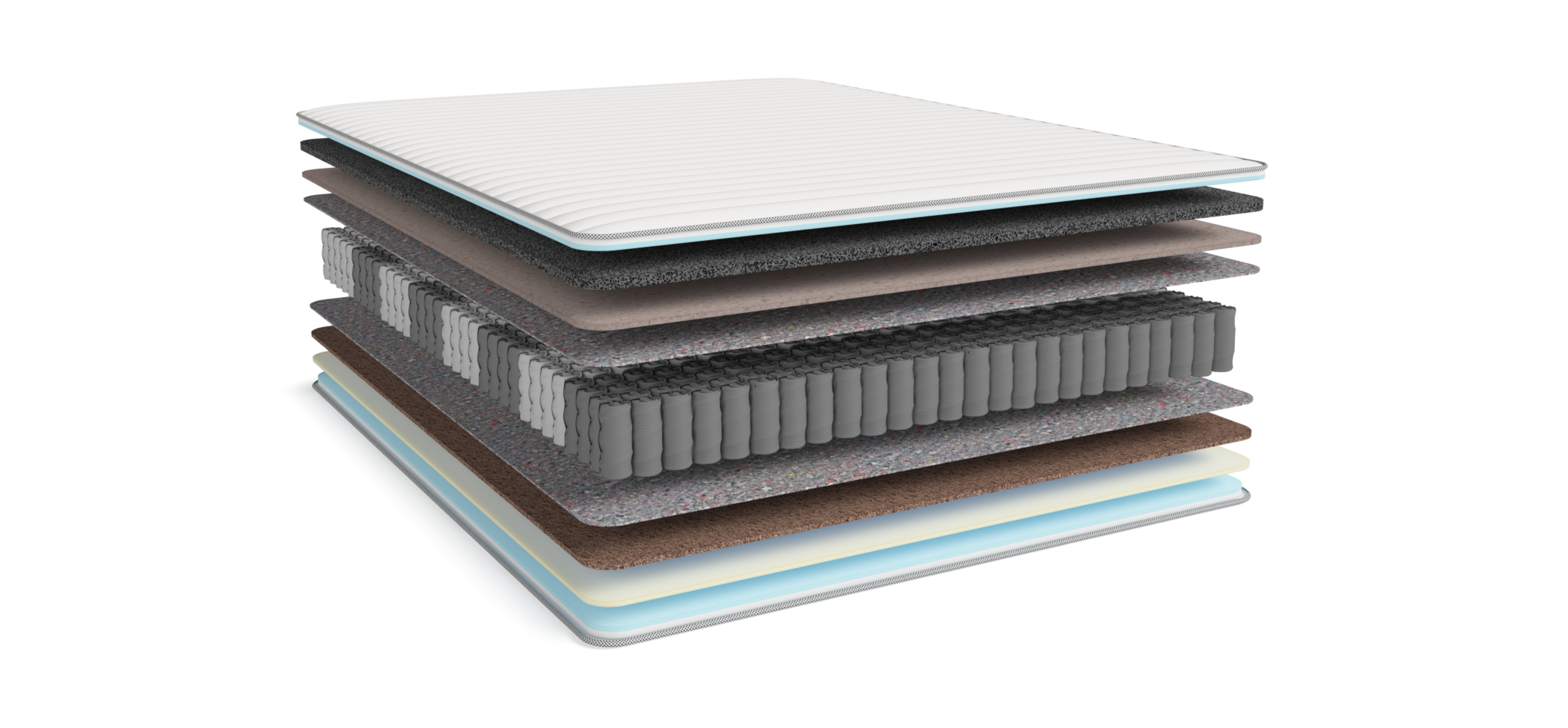 Угольная пена CARBONE FOAM, слой BOSS SKIN, термовойлок, НПБ COMFY SPRING 850, латексированная кокосовая койра, искусственный латекс