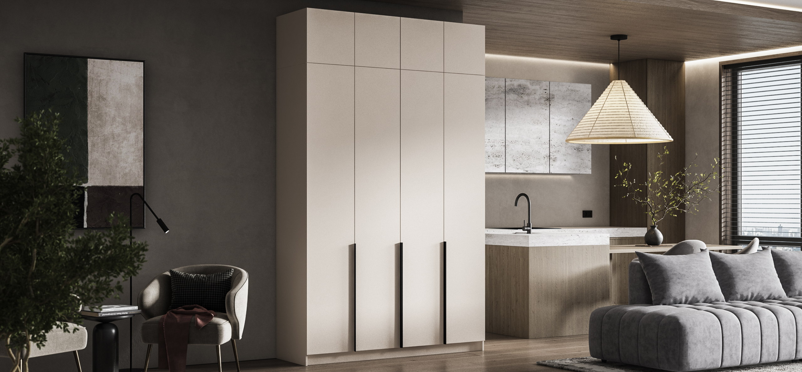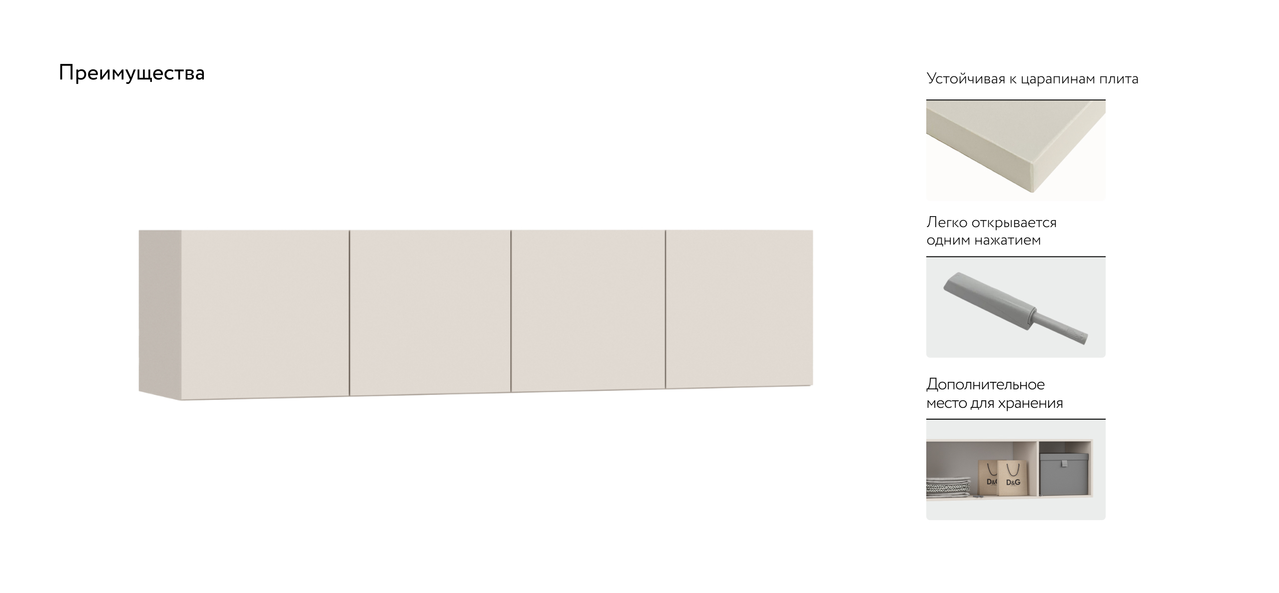 Открывайте фасады лёгким касанием — скрытые толкатели работают бесшумно, даря ощущение заботы о каждом жесте. Храните книги, декор или сезонные аксессуары так, чтобы они радовали глаз, а не собирали пыль.