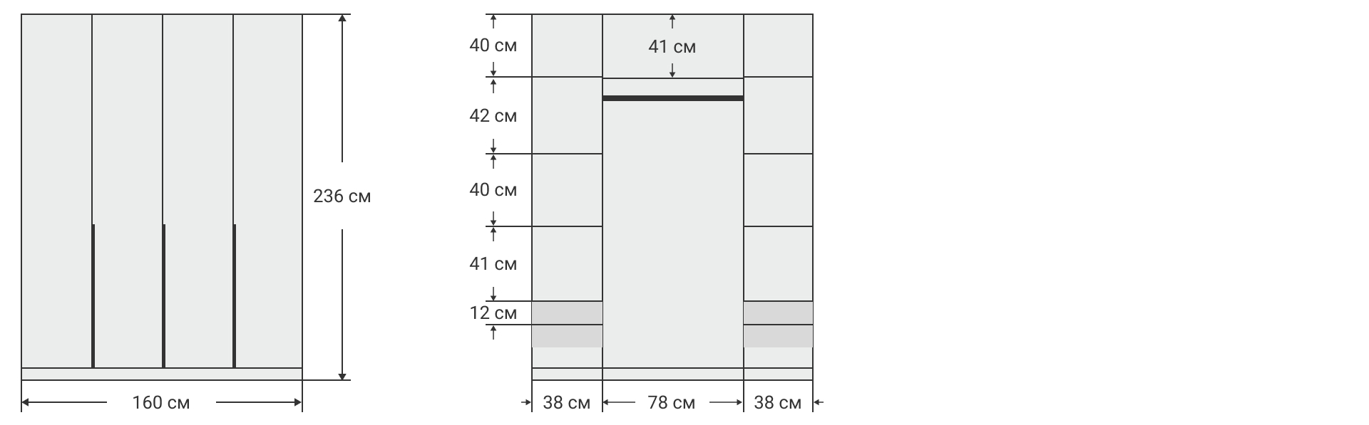 По бокам — две зеркальные секции: полки сверху, под ними — по два выдвижных ящика; в центре — штанга для длинной одежды. Двери с премиальными доводчиками закрываются мягко и бесшумно, а четыре ящика на шариковых направляющих выдвигаются плавно, ускоряя поиск вещей и избавляя от споров о «главной» стороне.
