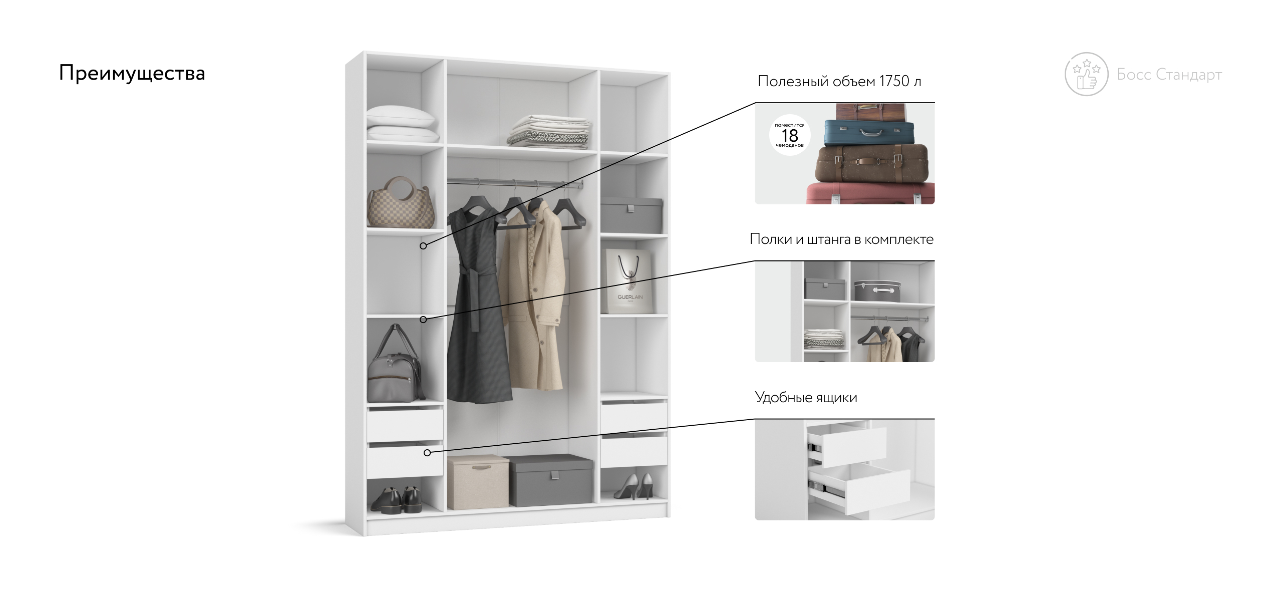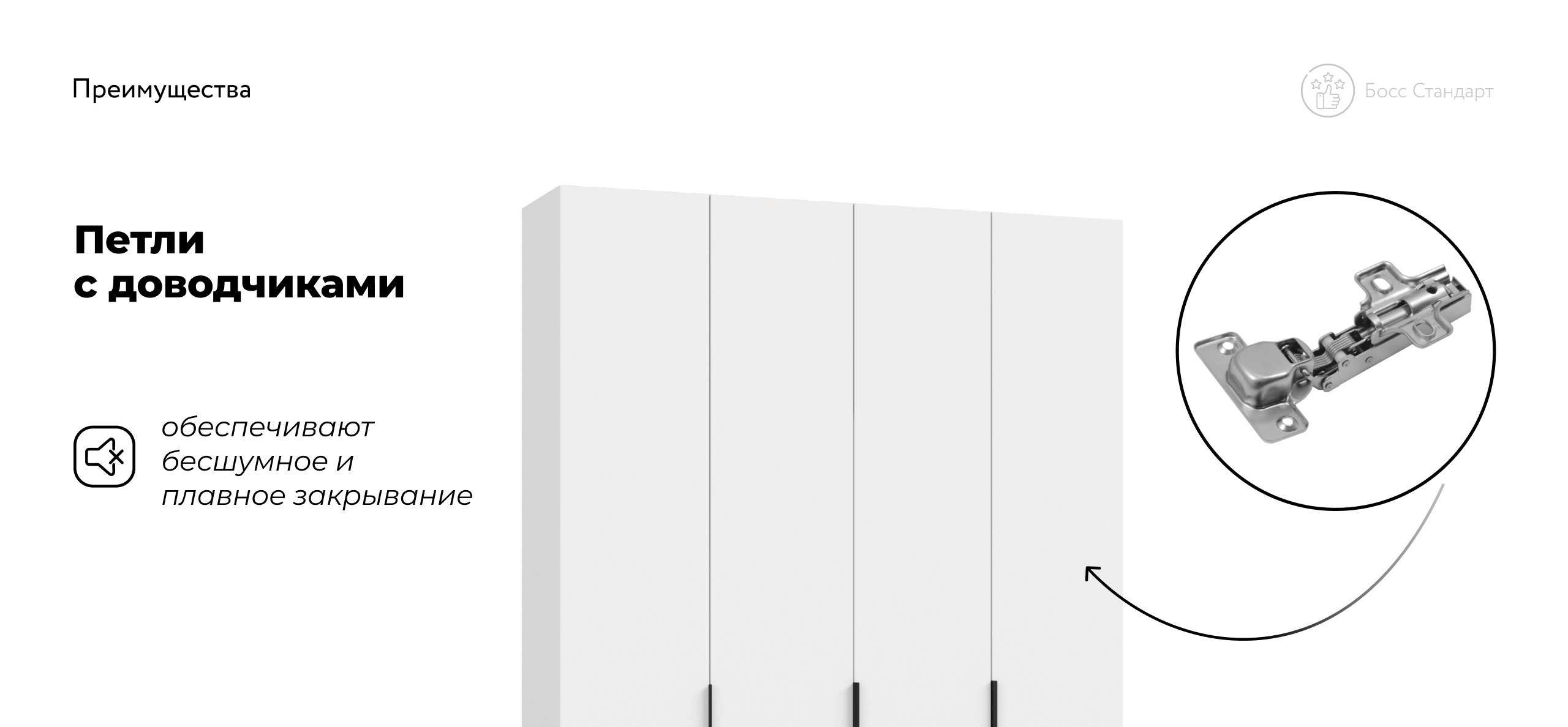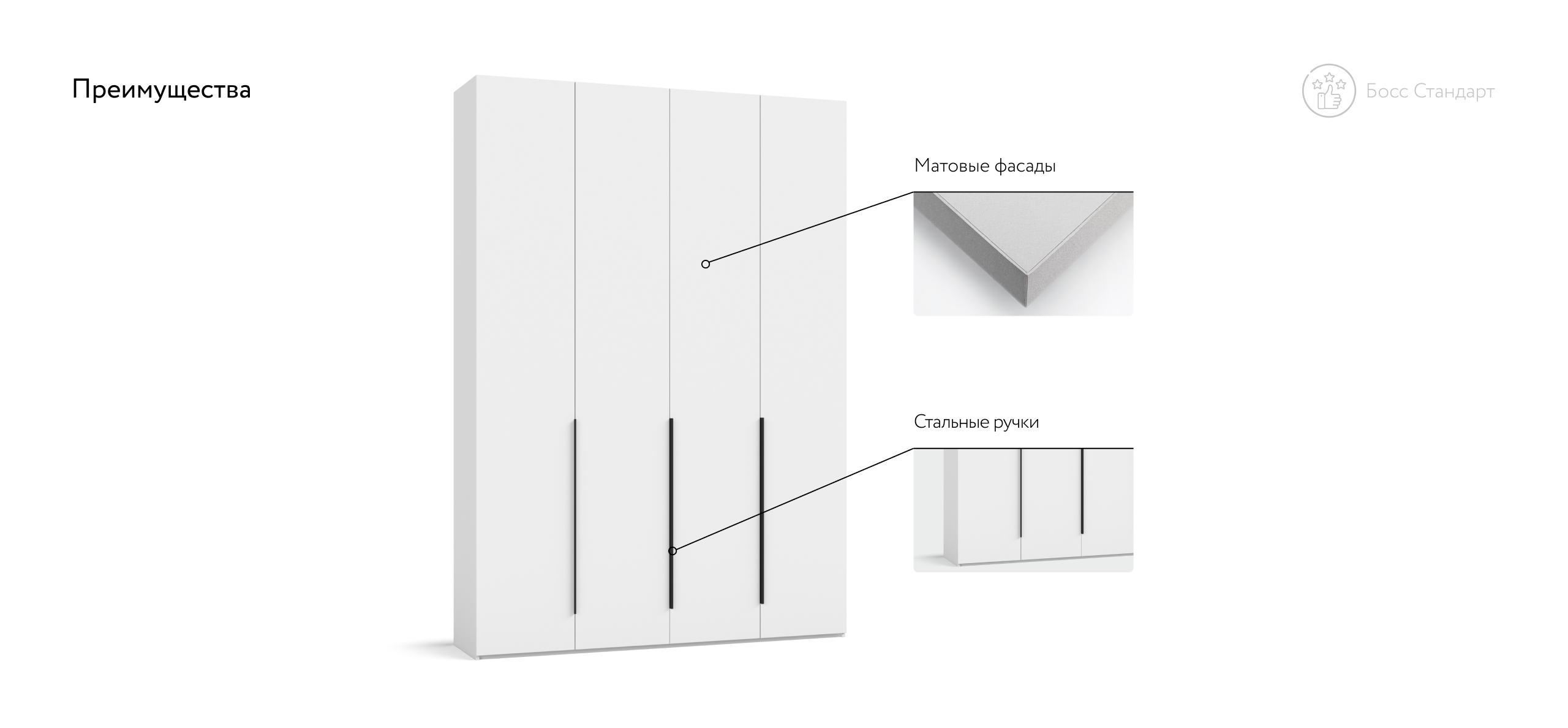 Корпус изготовлен из экологичной ЛДСП Е1 с износостойким покрытием, чтобы фактура и цвет радовали долгие годы. Босс Стандарт 160 дарит ощущение простора и упорядоченности, превращая спальню или гостевую комнату в гармоничное, «дышащее» пространство. Выберите шкаф, который не просто хранит вещи, а подчёркивает статус вашего интерьера.
