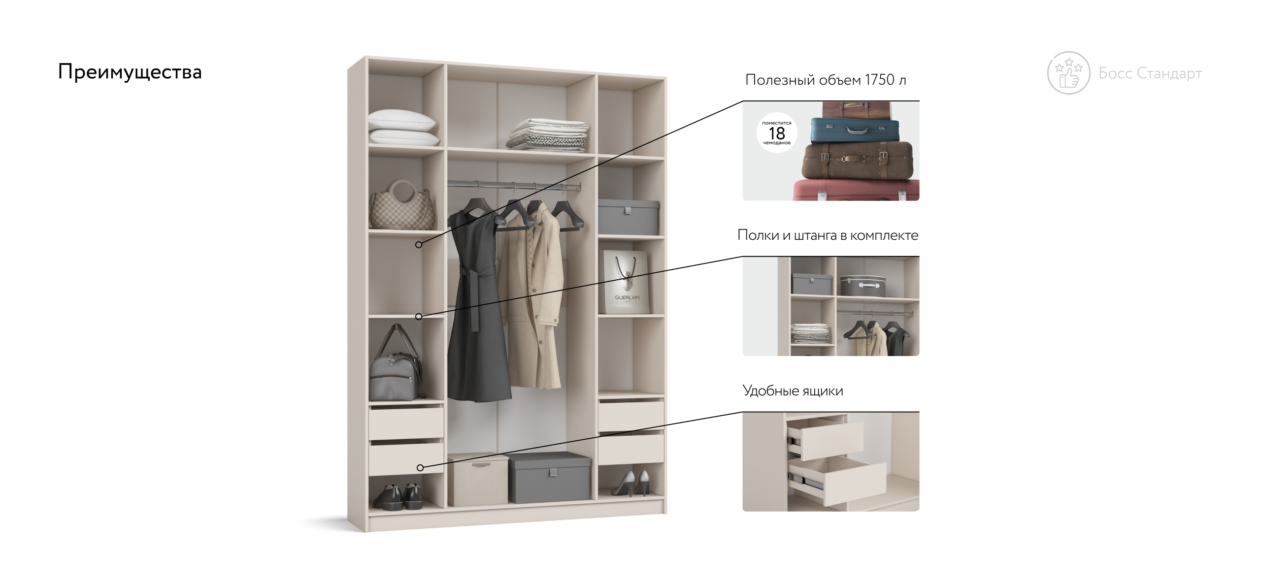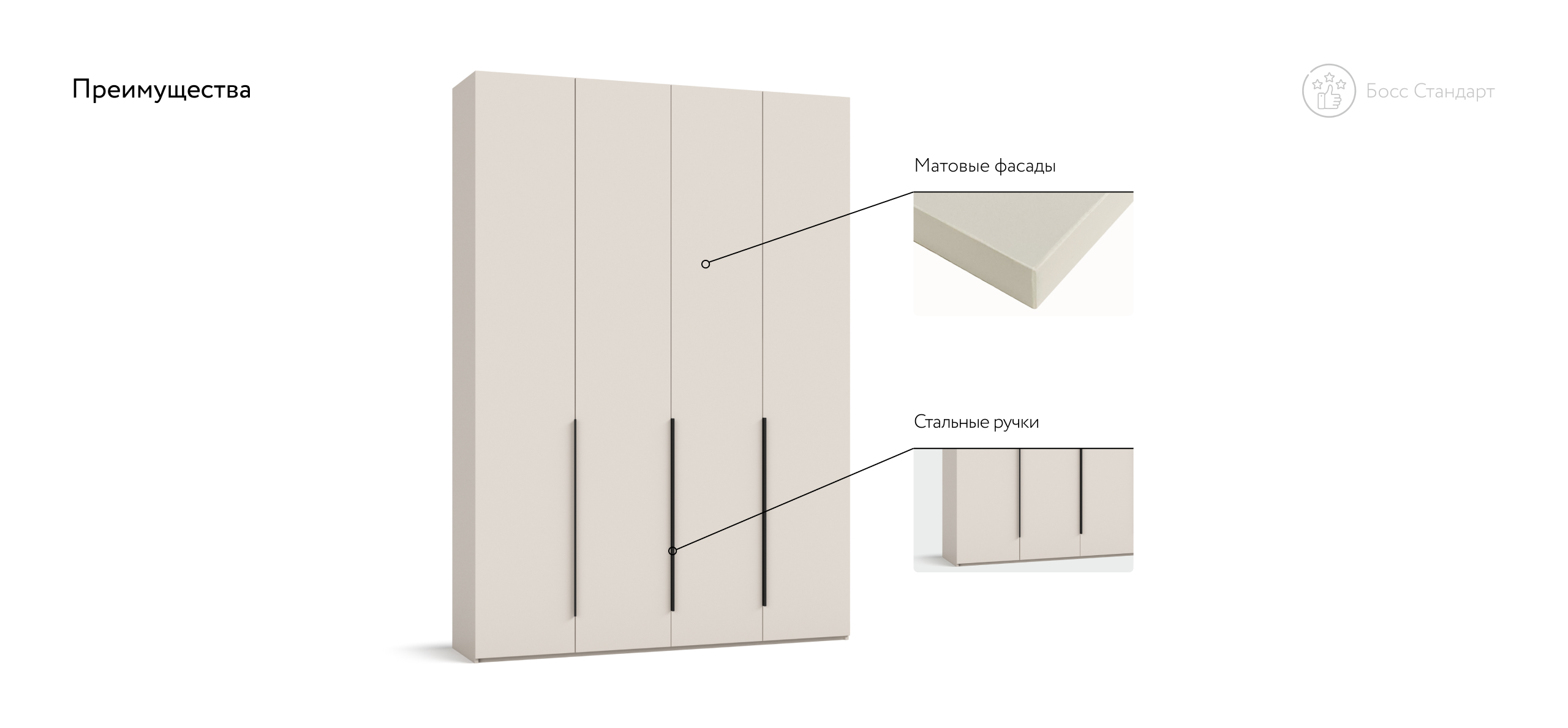 Корпус изготовлен из экологичной ЛДСП Е1 с износостойким покрытием, чтобы фактура и цвет радовали долгие годы. Босс Стандарт 160 дарит ощущение простора и упорядоченности, превращая спальню или гостевую комнату в гармоничное, «дышащее» пространство. Выберите шкаф, который не просто хранит вещи, а подчёркивает статус вашего интерьера.