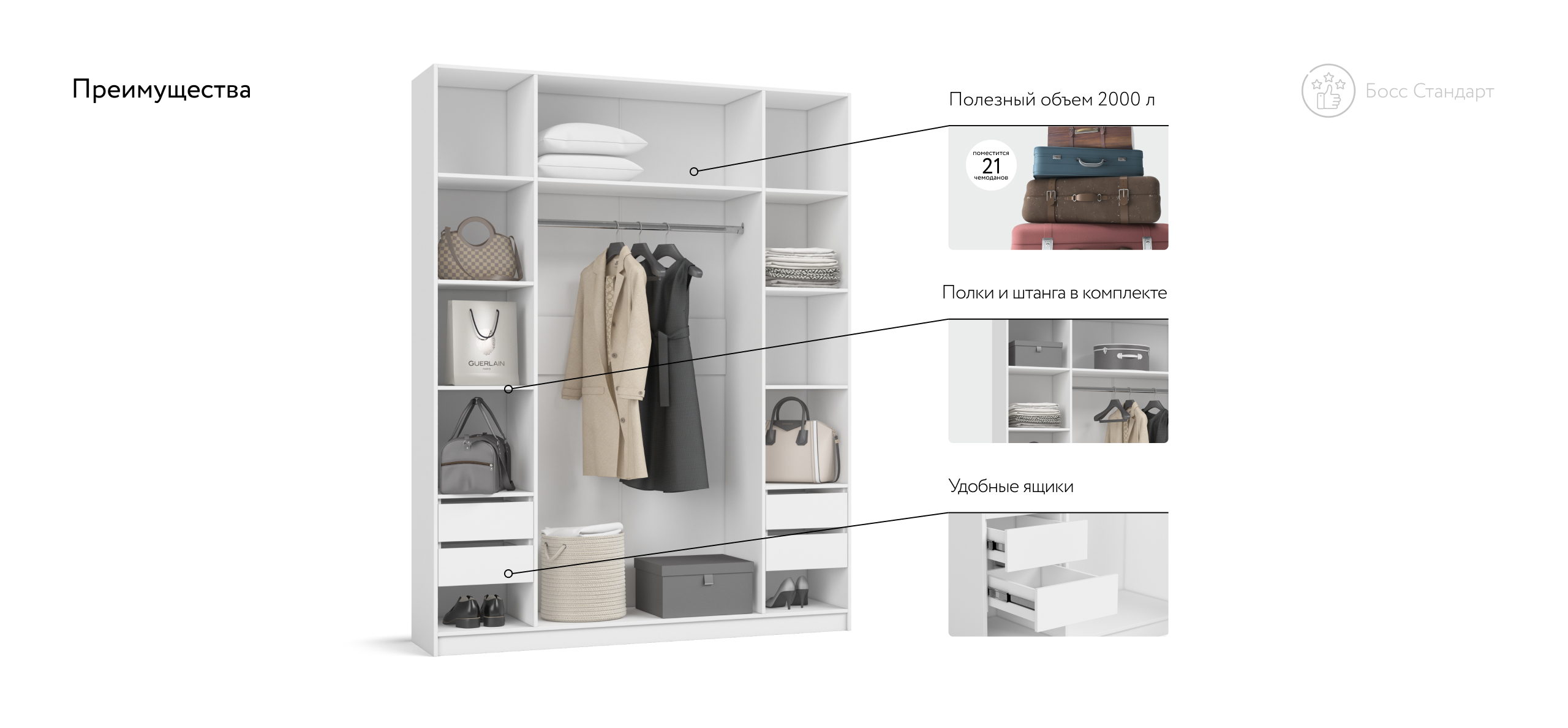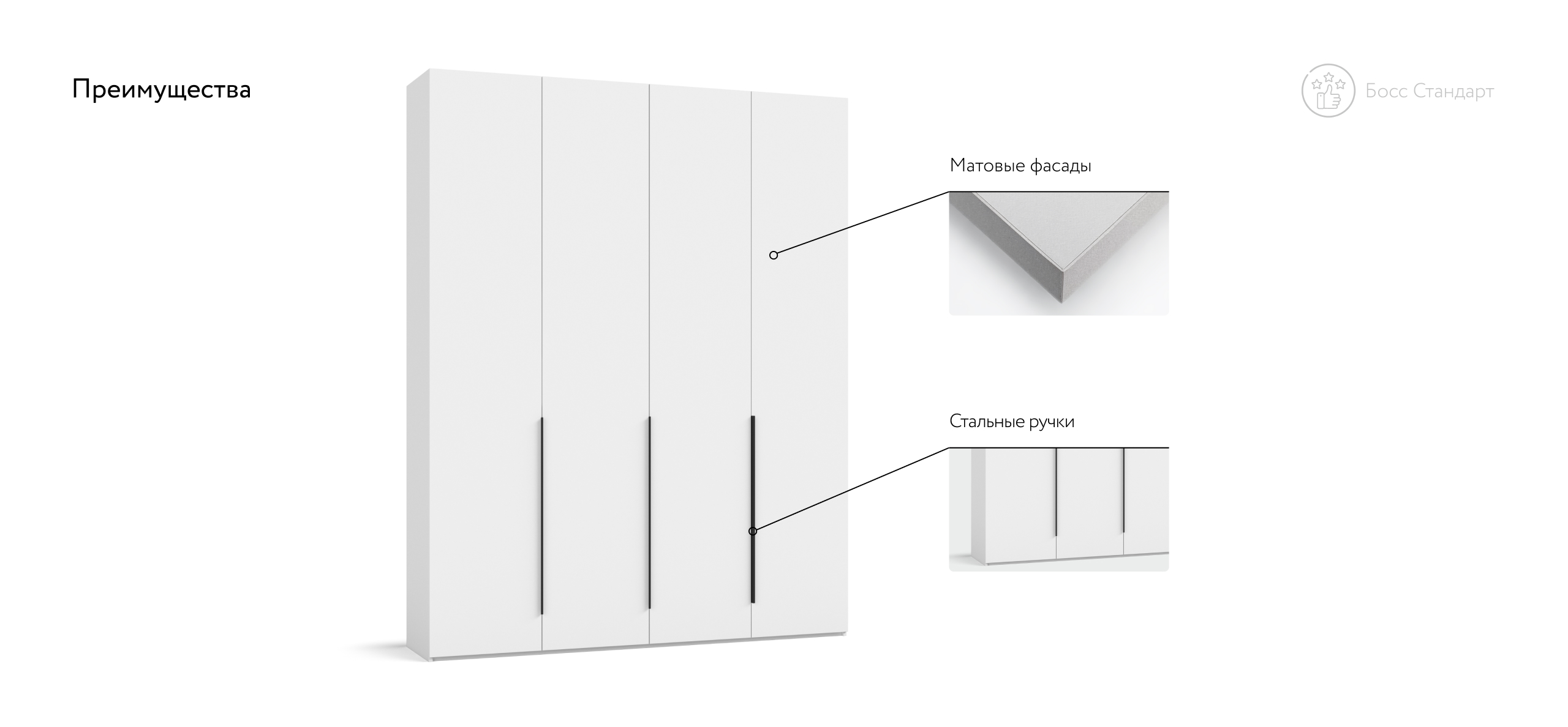Корпус изготовлен из безопасной ЛДСП Е1 с износостойким покрытием, чтобы фактура и цвет радовали долгие годы. Босс Стандарт 180 дарит ощущение простора и упорядоченности, превращая спальню или гостевую в гармоничное, «дышащее» пространство. Выберите шкаф, который не просто хранит вещи, а подчёркивает статус вашего интерьера.