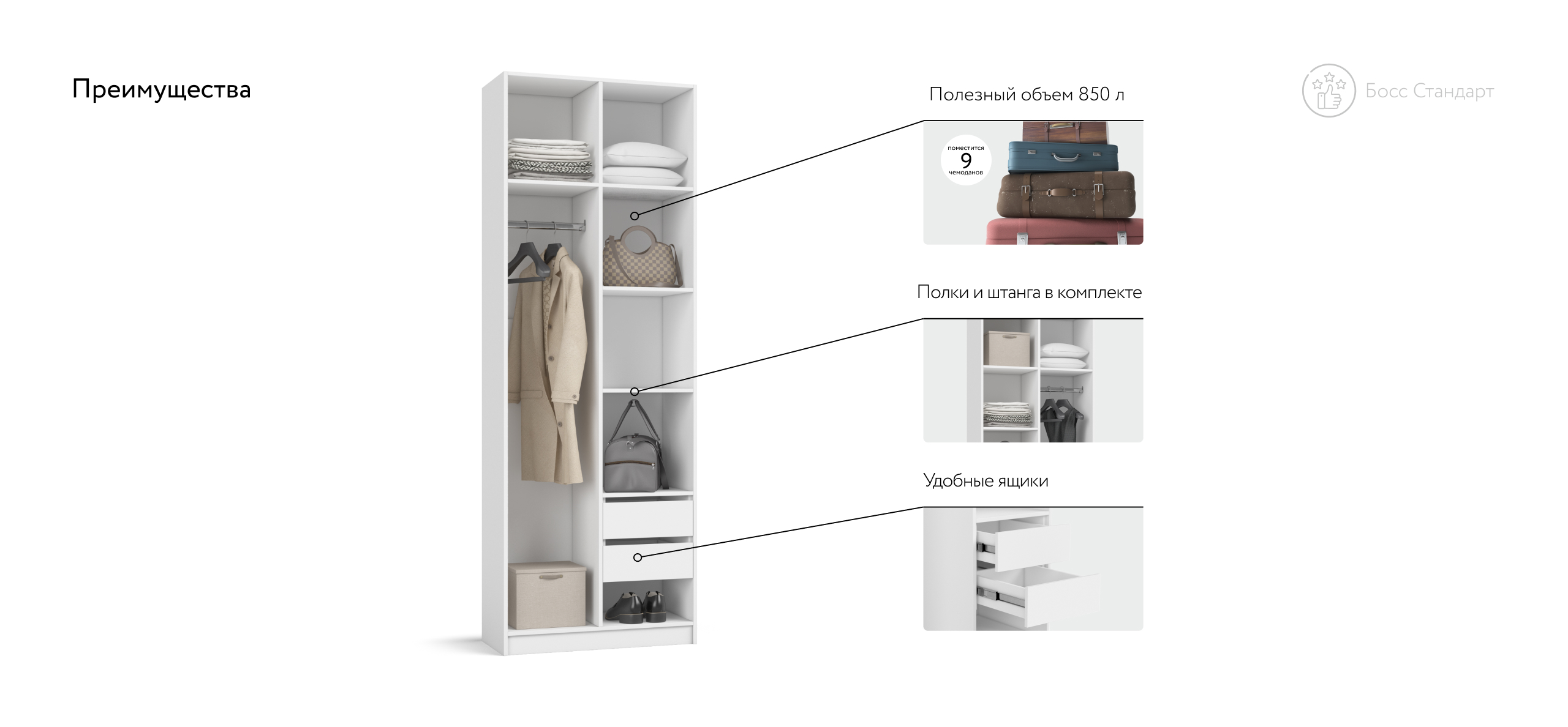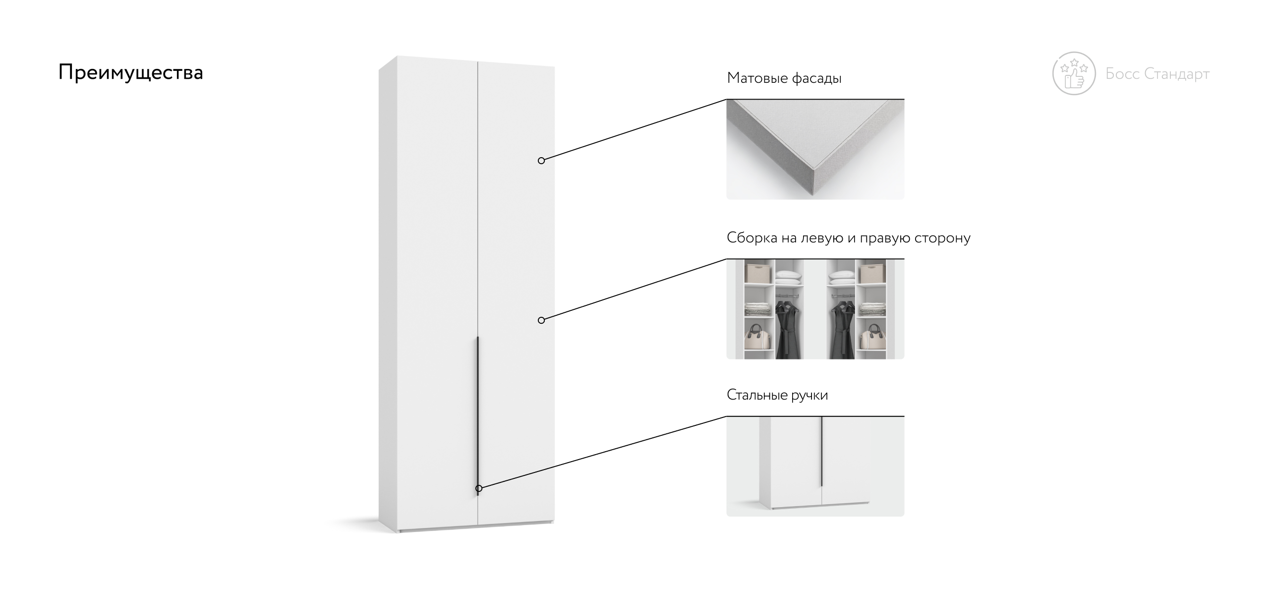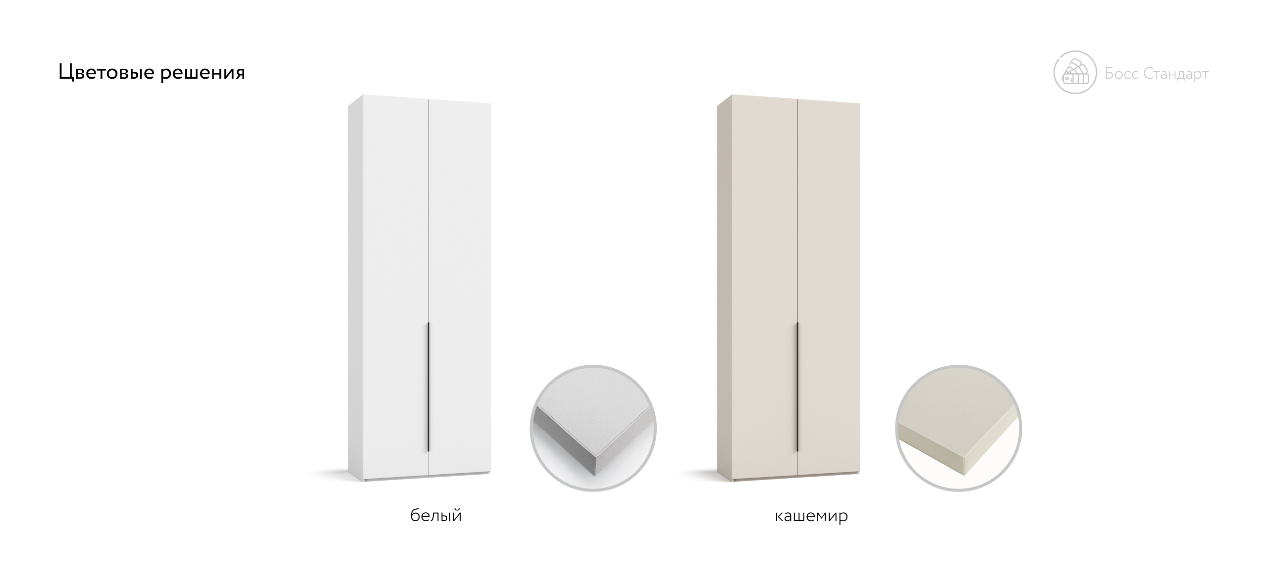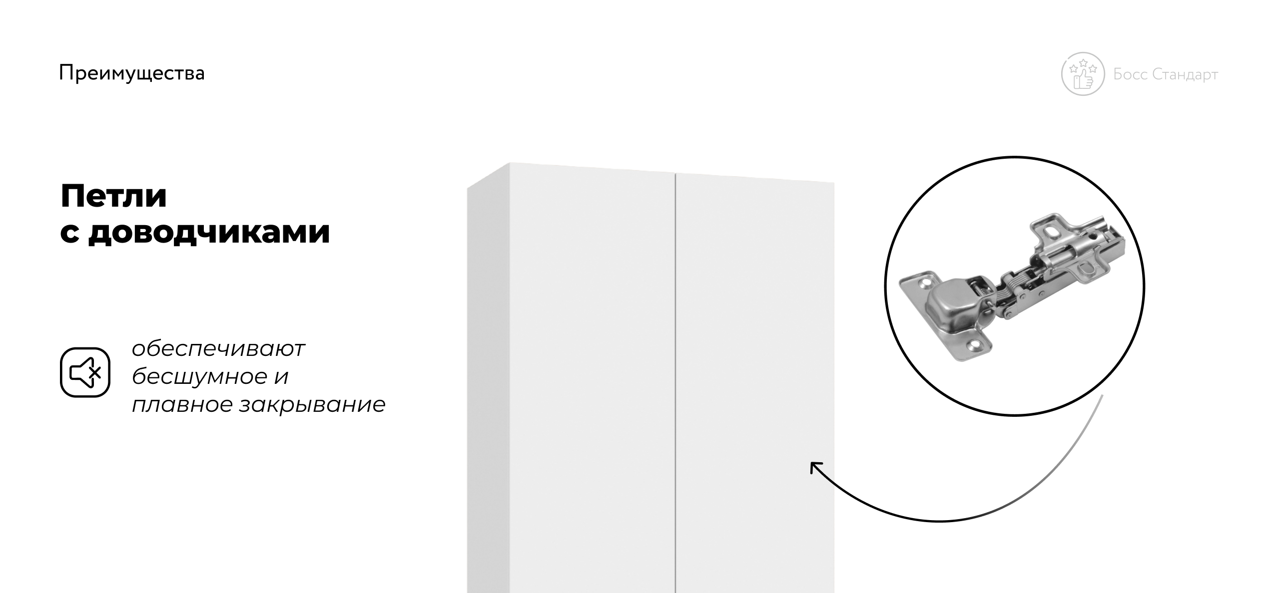 Гибкая компоновка превращает Босс Стандарт 80 в персональную систему хранения. Полки и два выдвижных ящика можно расположить справа или слева — выбирайте конфигурацию под планировку и ваши привычки. Двери с премиальными доводчиками открываются лёгким движением и закрываются мягко, поддерживая спокойный ритм утра.