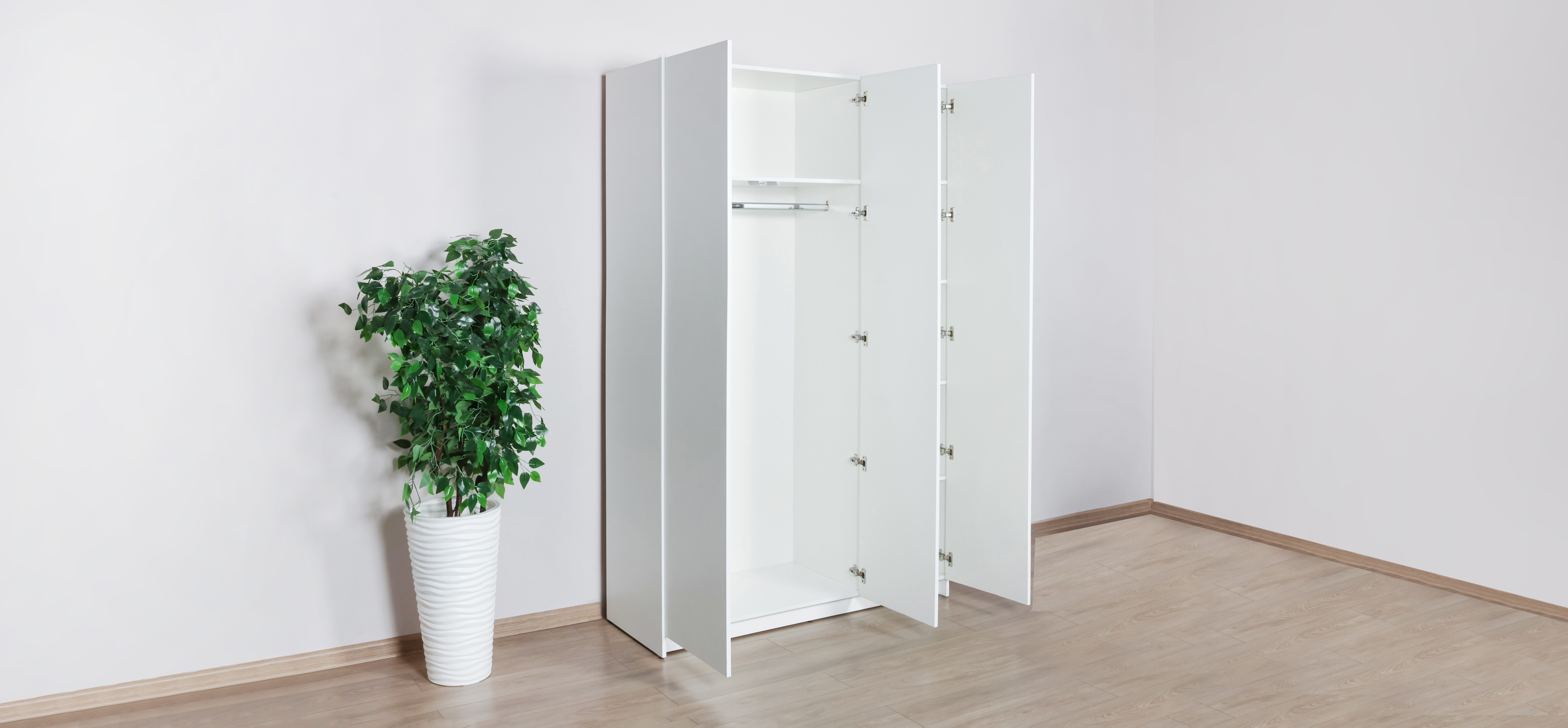 Шкаф становится ровно с первого раза: регулируемые опоры выравнивают его на любом покрытии, линии сходятся, зазоры аккуратные, двери работают мягко и стабильно. Материалы — практичные и безопасные для дома (ЛДСП Е1), аккуратная кромка держит форму и внешний вид годами.