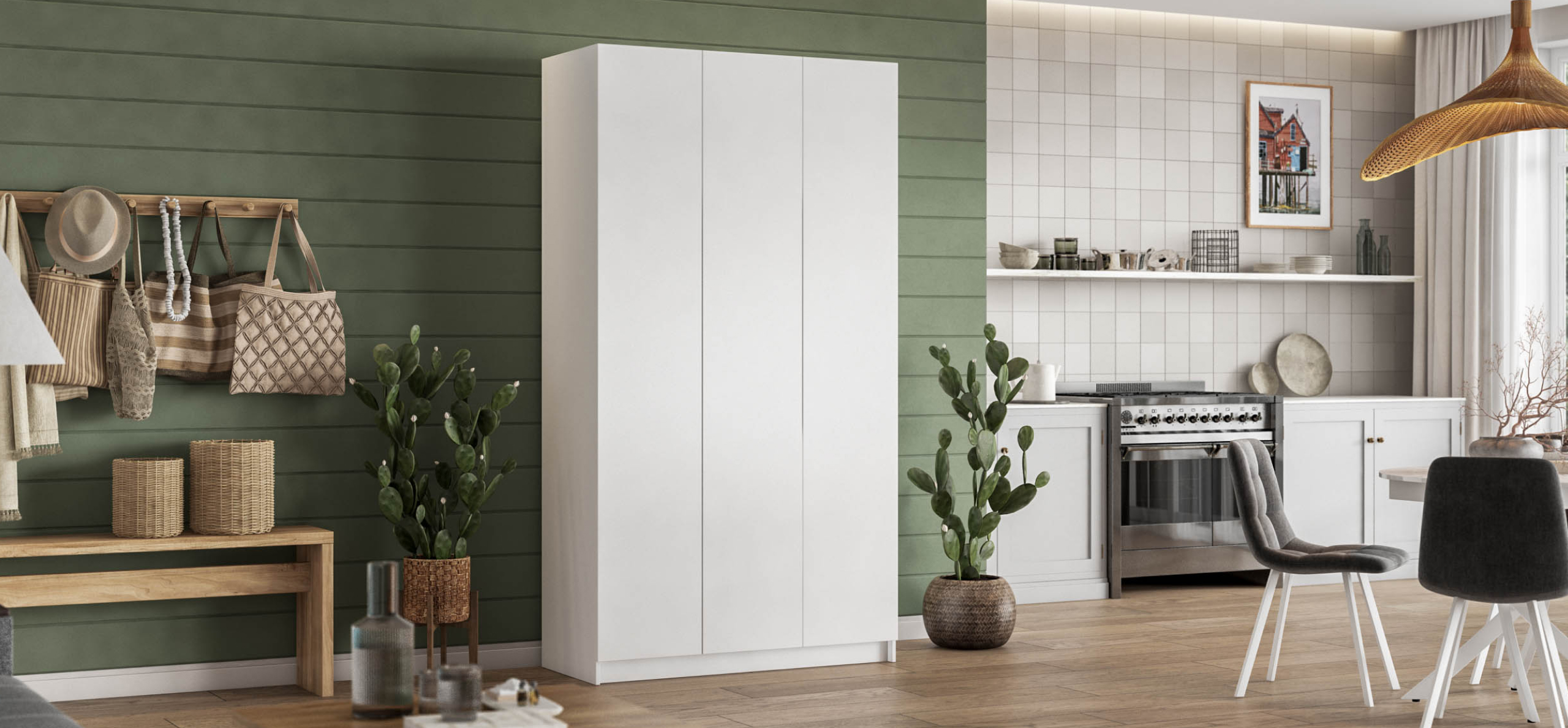 Два оттенка — тёплый Кашемир и светлый Белый — легко встраиваются в сценарии городской квартиры: от спокойного минимализма до мягкой неоклассики. Итог — ощущение воздуха и контроля: вещи живут по правилам, а пространство — по вашим.