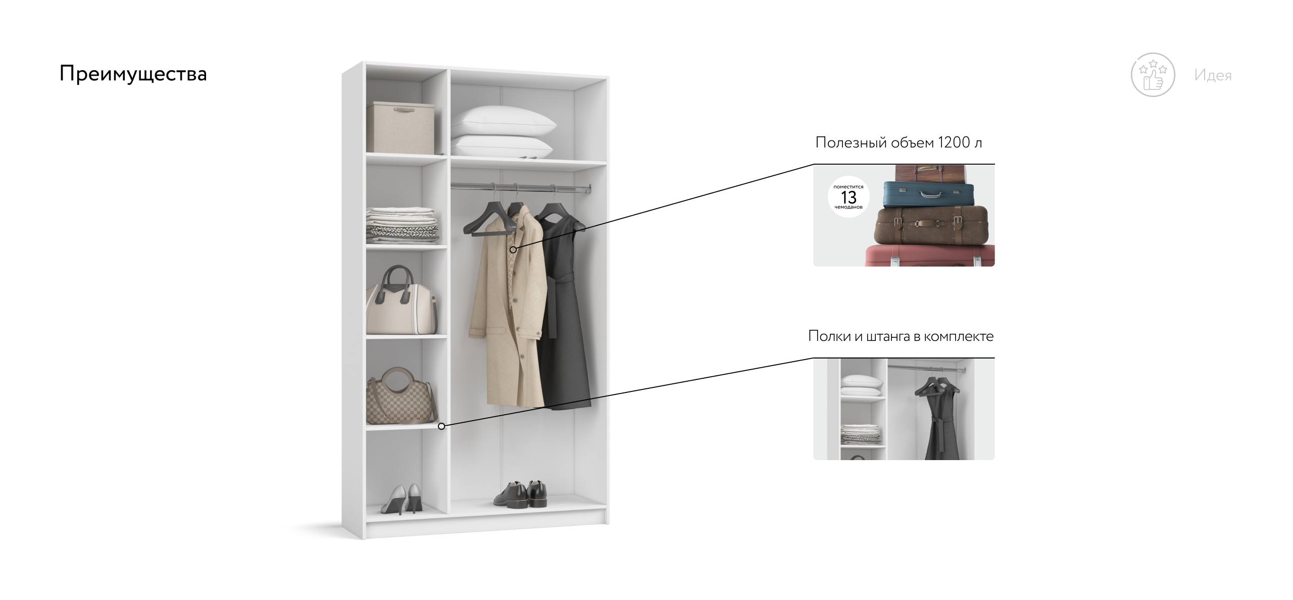 Внутри — ясная логика. Универсальная сборка подстраивается под планировку: полки и штанга легко меняют сторону, зеркалясь вправо или влево без компромиссов. Основной объём уверенно берёт на себя содержимое 13 крупных чемоданов — сезонный гардероб, коробки с обувью, постельное — всё разложено, всё на виду.