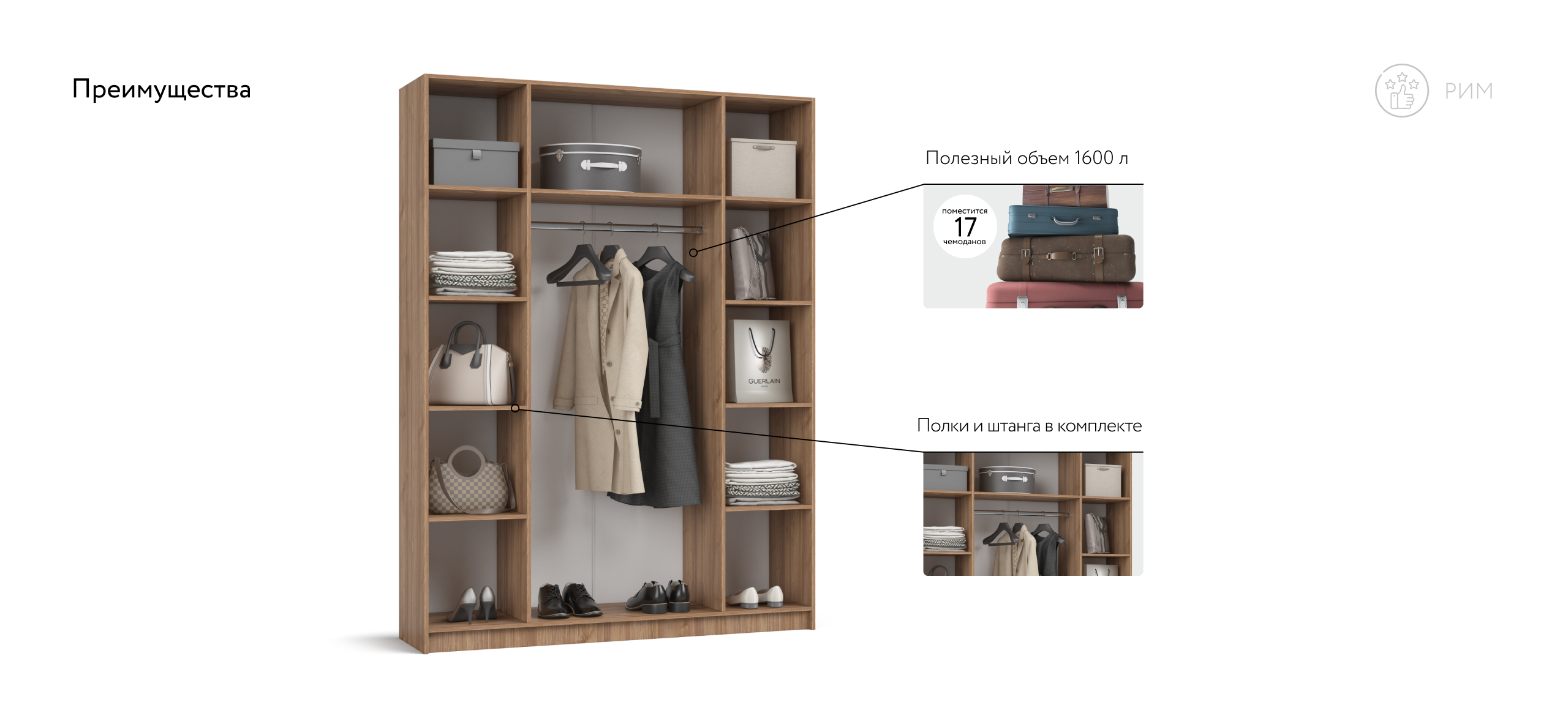 По бокам — две симметричные секции с полками на всю высоту, а в центре — штанга для длинной одежды. Такая компоновка экономит время на поиск вещей и избавляет от необходимости выбирать, какая сторона «главная». Полки выдерживают серьёзную нагрузку, а створки открываются плавным движением, не нарушая утренний ритм.