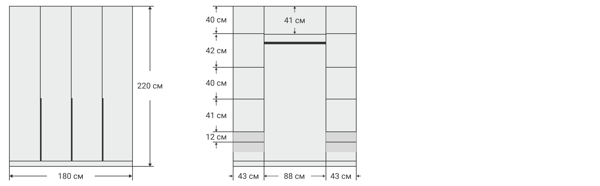 По бокам — две симметричные секции: полки сверху, а под ними — по два выдвижных ящика; в центре — штанга для длинной одежды. Такая компоновка экономит время на поиск вещей и избавляет от необходимости выбирать, какая сторона «главная». Четыре ящика на шариковых направляющих выдвигаются легко и бесшумно, а створки открываются плавным движением, не нарушая утренний ритм.