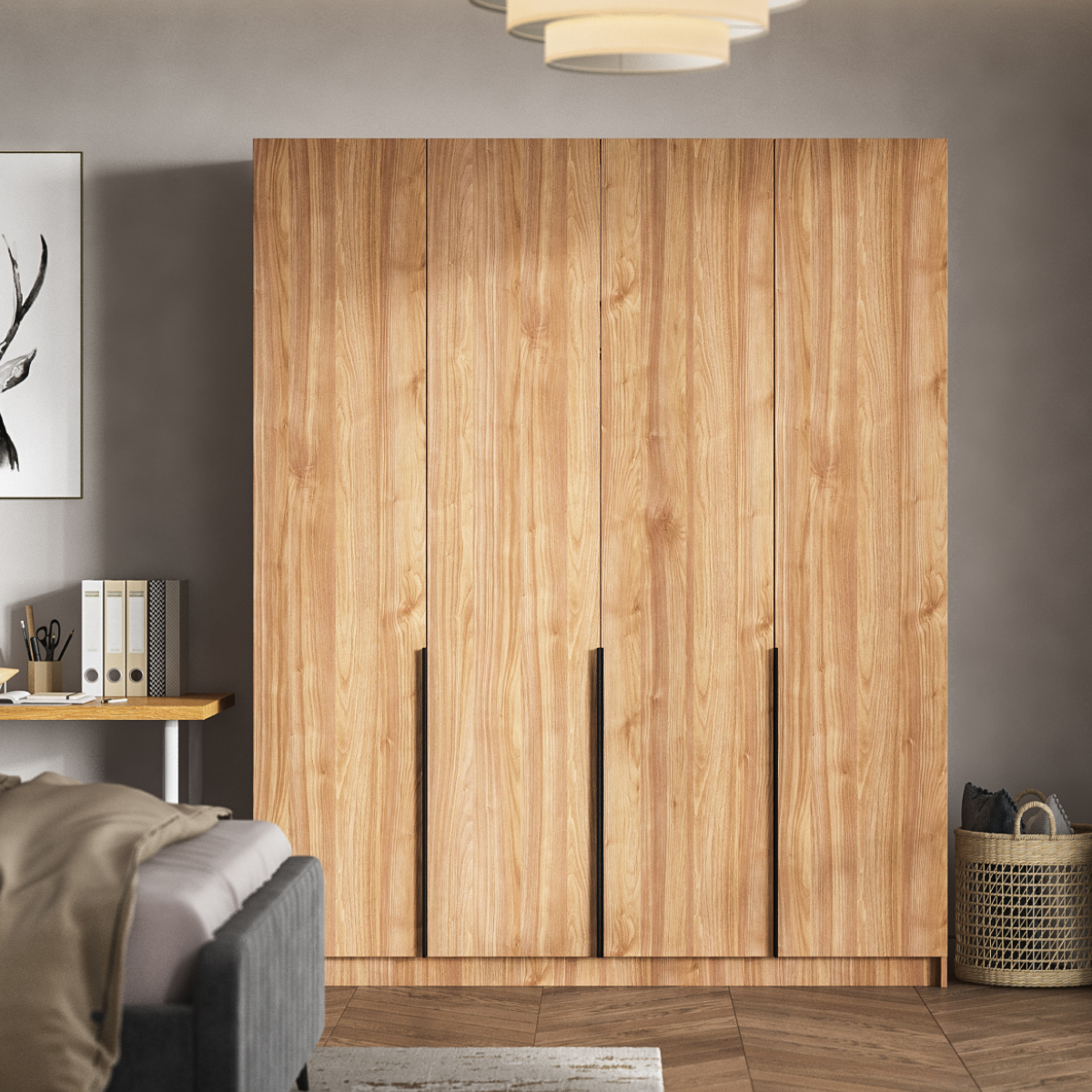 По бокам — две симметричные секции: полки сверху, а под ними — по два выдвижных ящика; в центре — штанга для длинной одежды. Такая компоновка экономит время на поиск вещей и избавляет от необходимости выбирать, какая сторона «главная». Четыре ящика на шариковых направляющих выдвигаются легко и бесшумно, а створки открываются плавным движением, не нарушая утренний ритм.