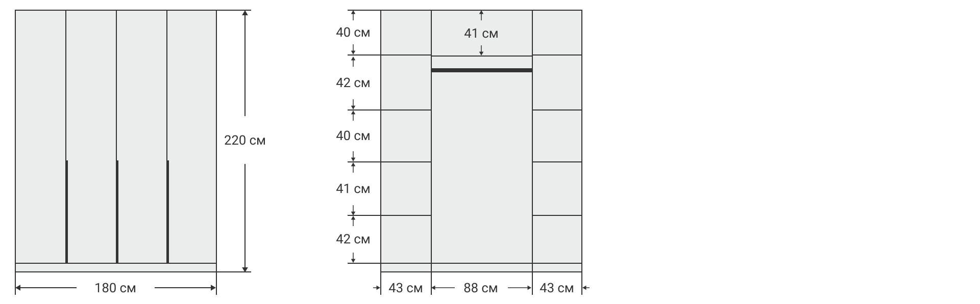 По бокам — две симметричные секции с полками на всю высоту, а в центре — штанга для длинной одежды. Такая компоновка экономит время на поиск вещей и избавляет от необходимости выбирать, какая сторона «главная». Полки выдерживают серьёзную нагрузку, а створки открываются плавным движением, не нарушая утренний ритм.