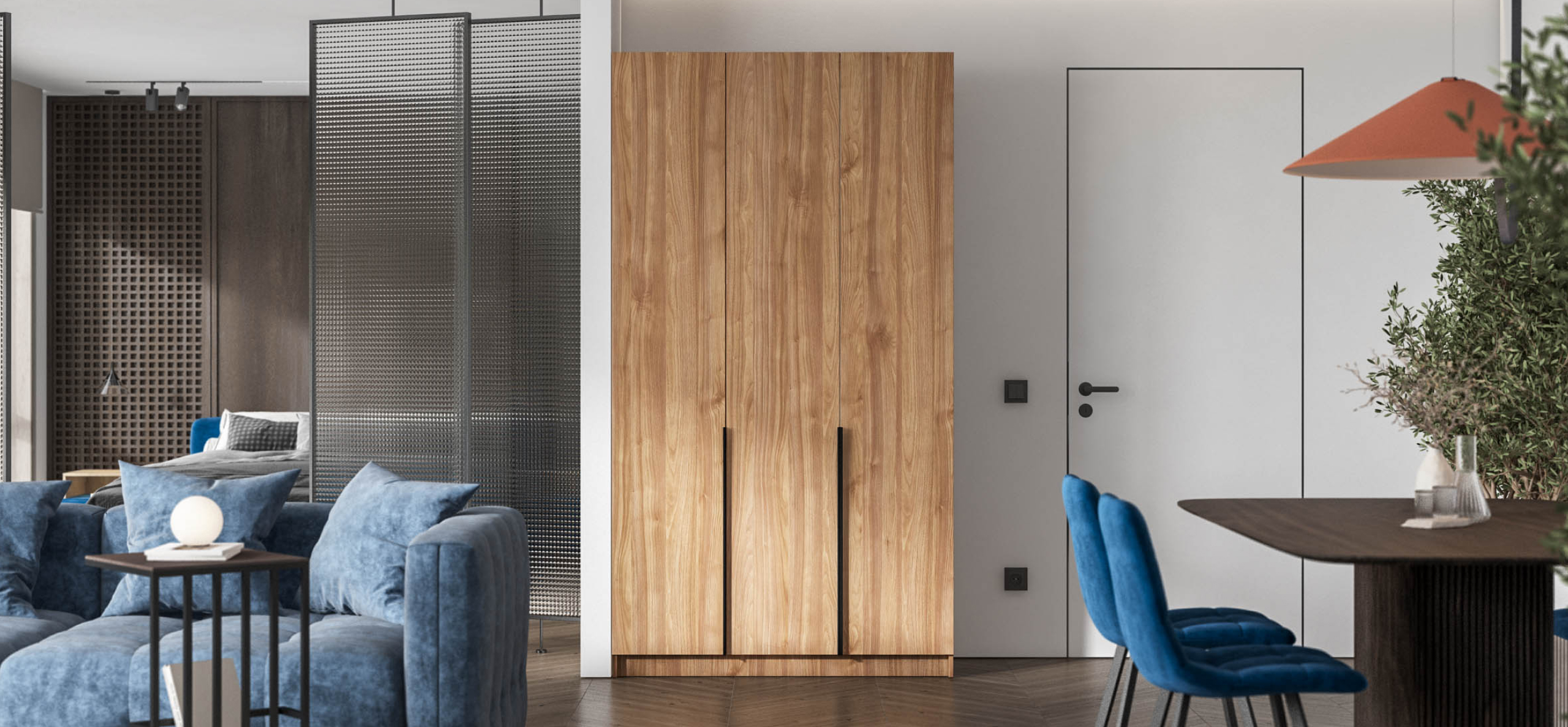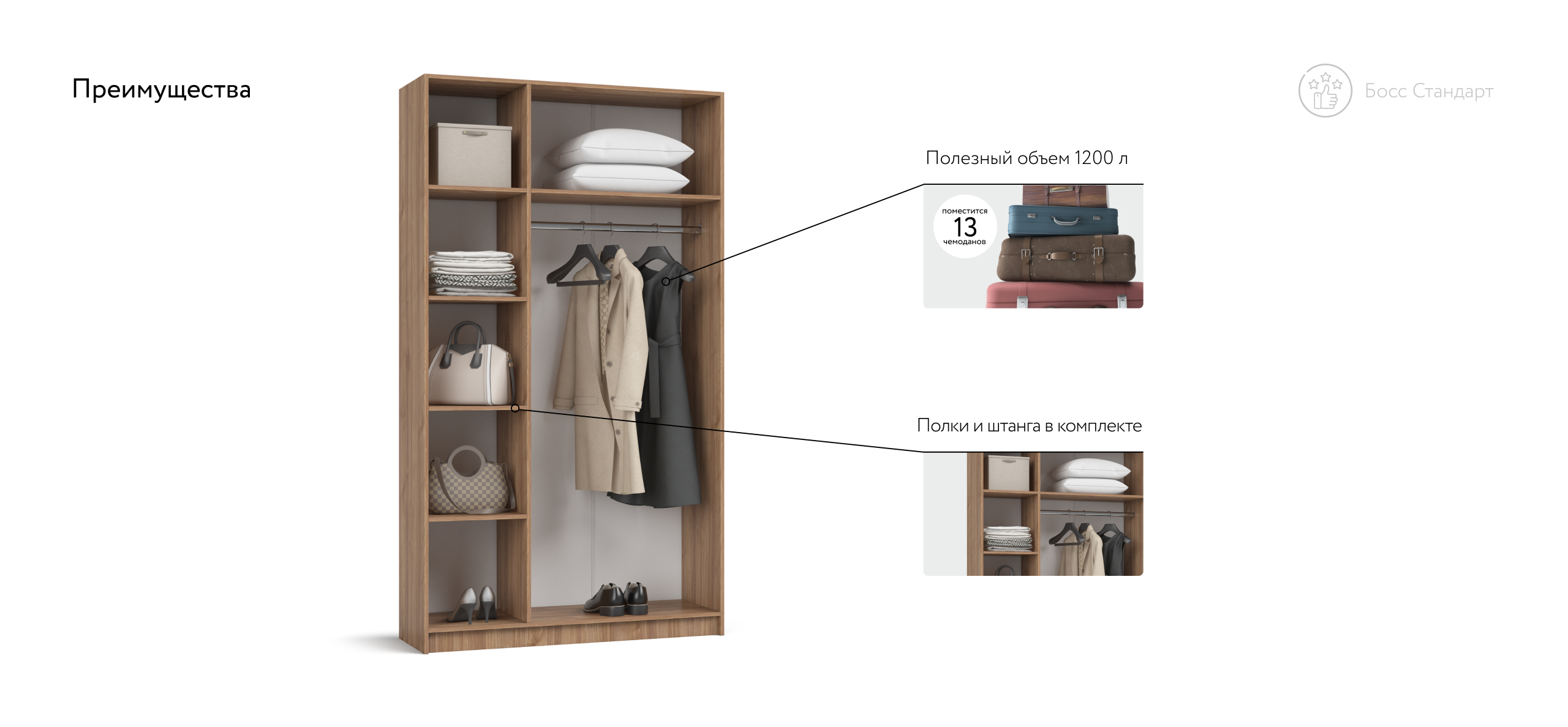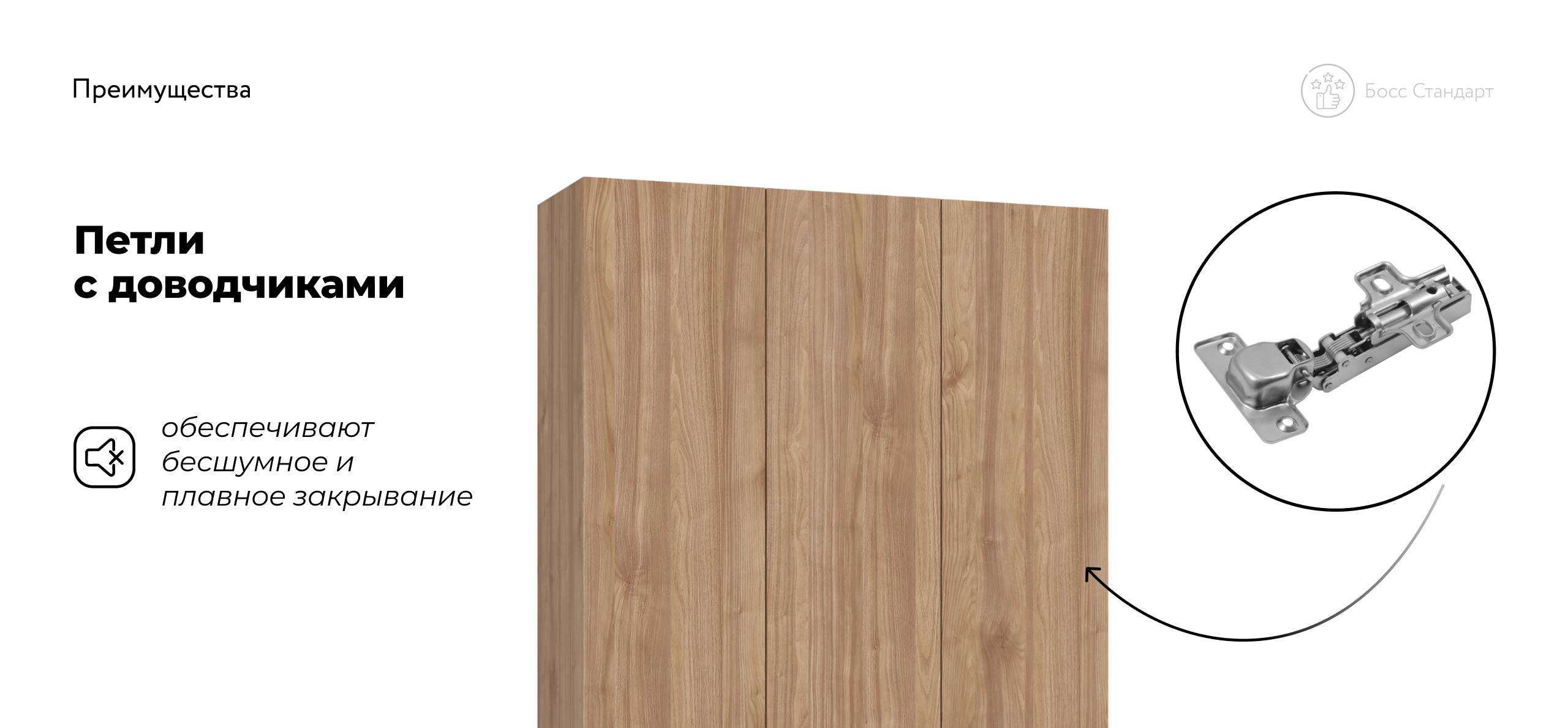 Двери с премиальными доводчиками открываются мягко и бесшумно, превращая утренний сбор в тихий ритуал. Корпус изготовлен из безопасной ЛДСП Е1 с износостойким покрытием, а аккуратно отделанная задняя стенка позволяет установить шкаф не только у стены, но и в свободной планировке. Босс Стандарт 120 создаёт ощущение простора и упорядоченности, превращая спальню или гостевую комнату в гармоничное, «дышащее» пространство.