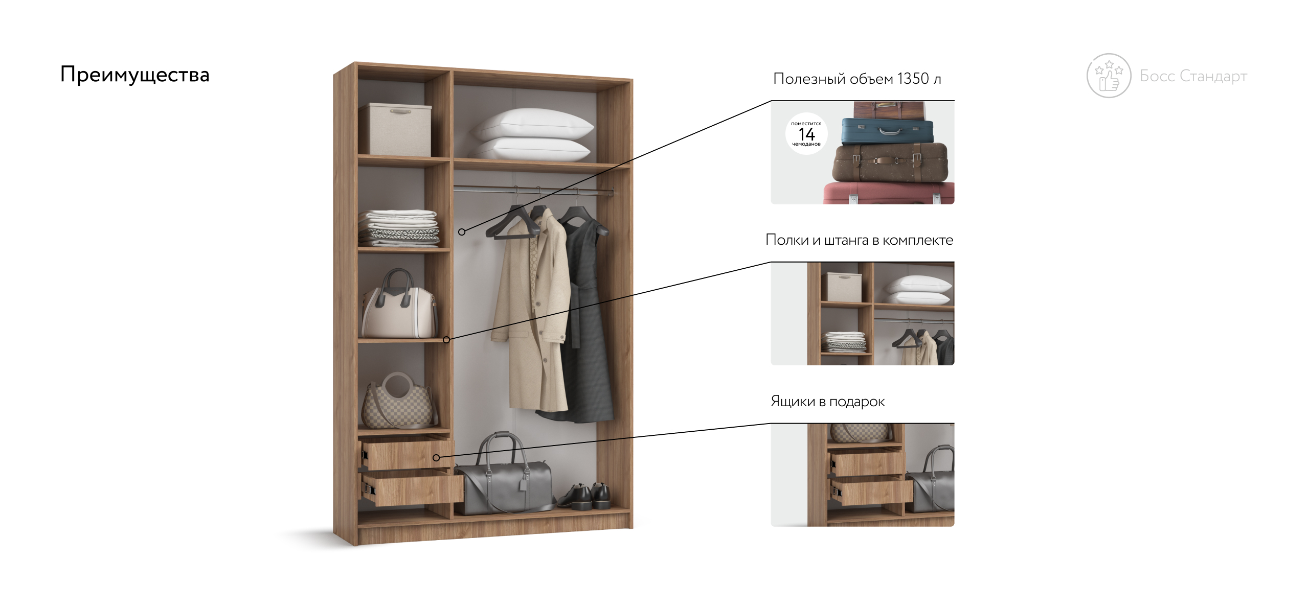 Гибкая компоновка превращает Босс Стандарт 135 в личный конструктор хранения. Полки и два выдвижных ящика можно установить справа или слева — по планировке и вашим привычкам. Двери с премиальными доводчиками открываются лёгким движением и закрываются плавно; ящики на шариковых направляющих выдвигаются бесшумно, не прерывая утренний ритм.
