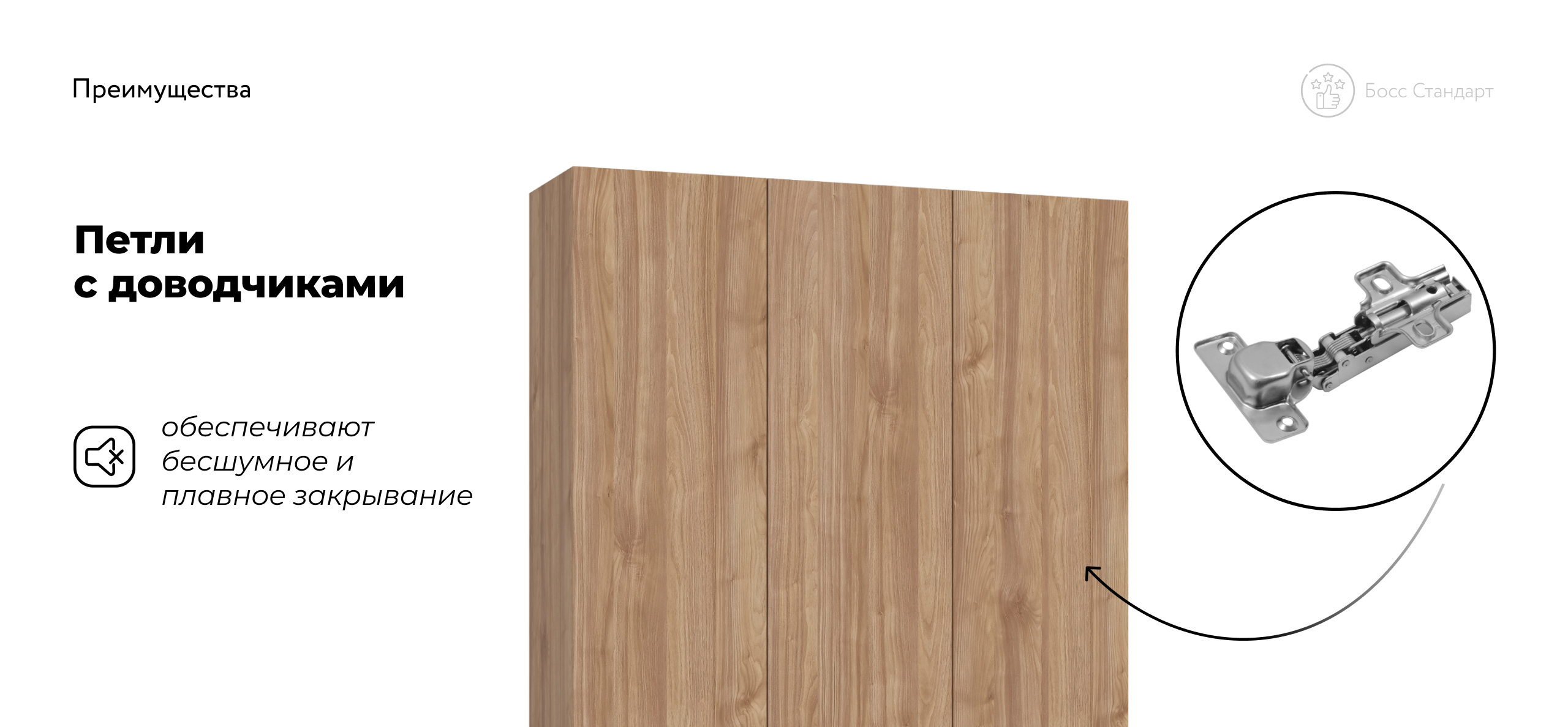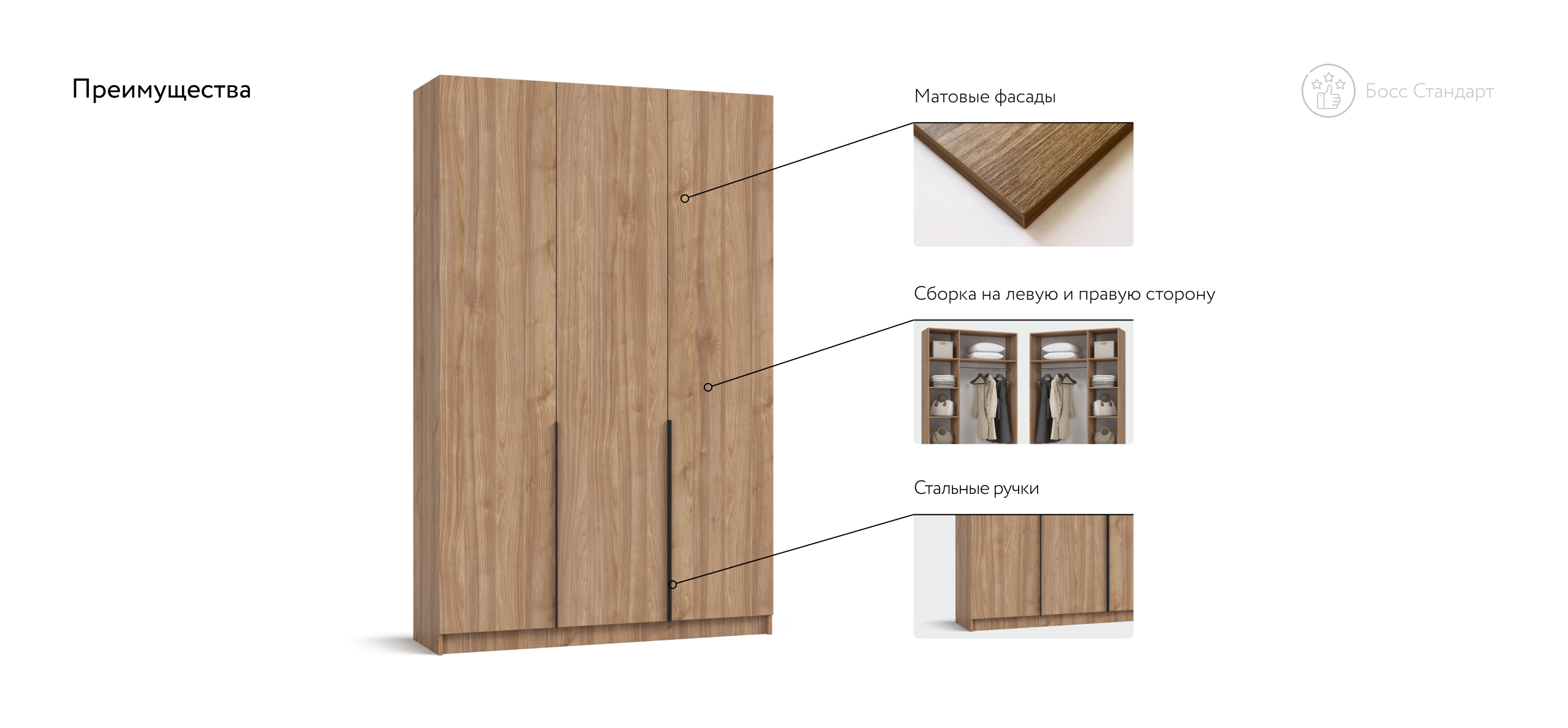 Петли со встроенными доводчиками обеспечивают плавное и бесшумное закрывание створок, превращая утренний сбор в по‑настоящему тихий ритуал. Корпус изготовлен из экологичной ЛДСП Е1 с износостойким покрытием, а опрятно выполненная задняя панель даёт возможность ставить шкаф не только у стены, но и в свободной планировке. Босс Стандарт 135 создаёт ощущение простора и упорядоченности, превращая спальню или гостевую комнату в гармоничное, «дышащее» пространство.