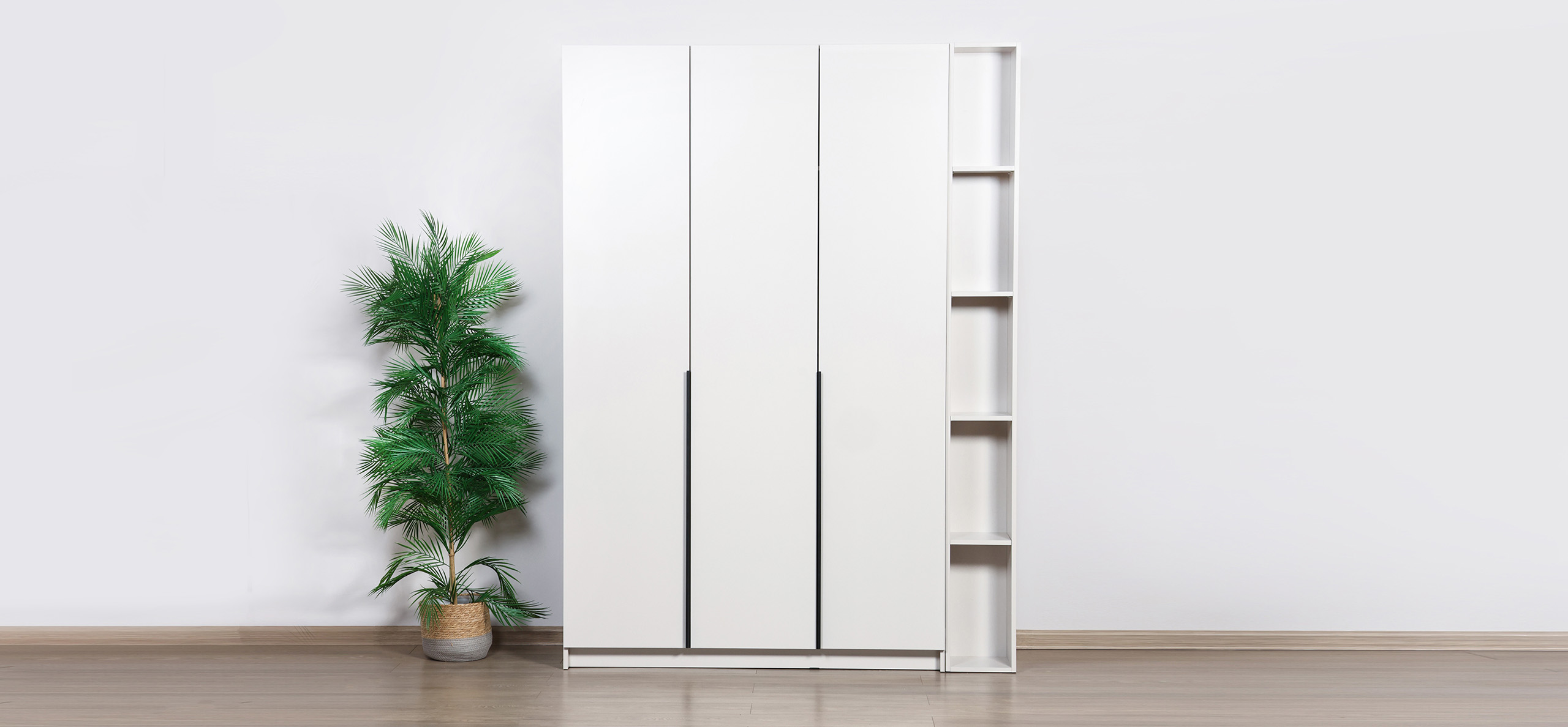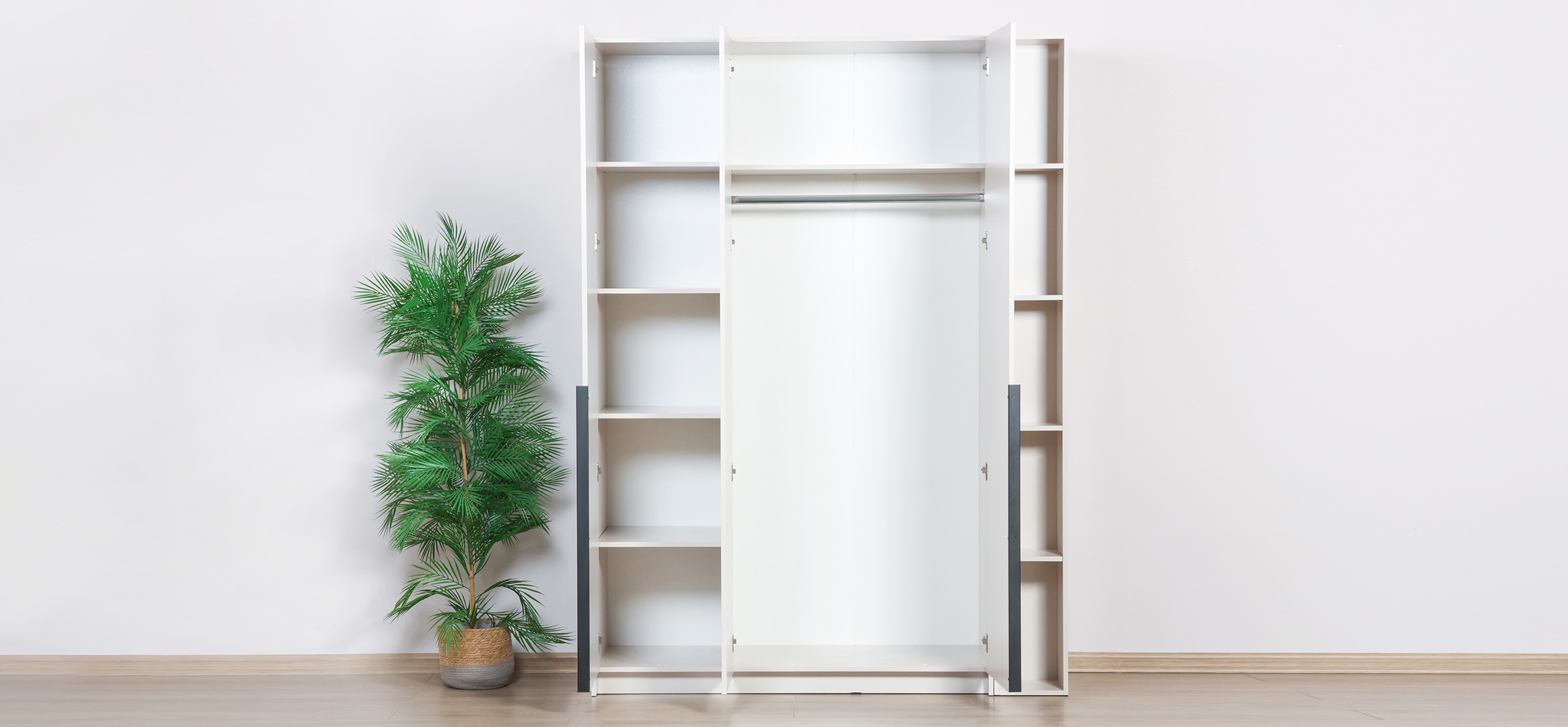 Внутри продуман каждый сантиметр: по бокам — полки на всю высоту для аккуратного текстиля и обувных коробок, в центре — штанга для длинной одежды. Полки легко переставляются, позволяя адаптировать пространство под сезонный гардероб без лишних перестановок.