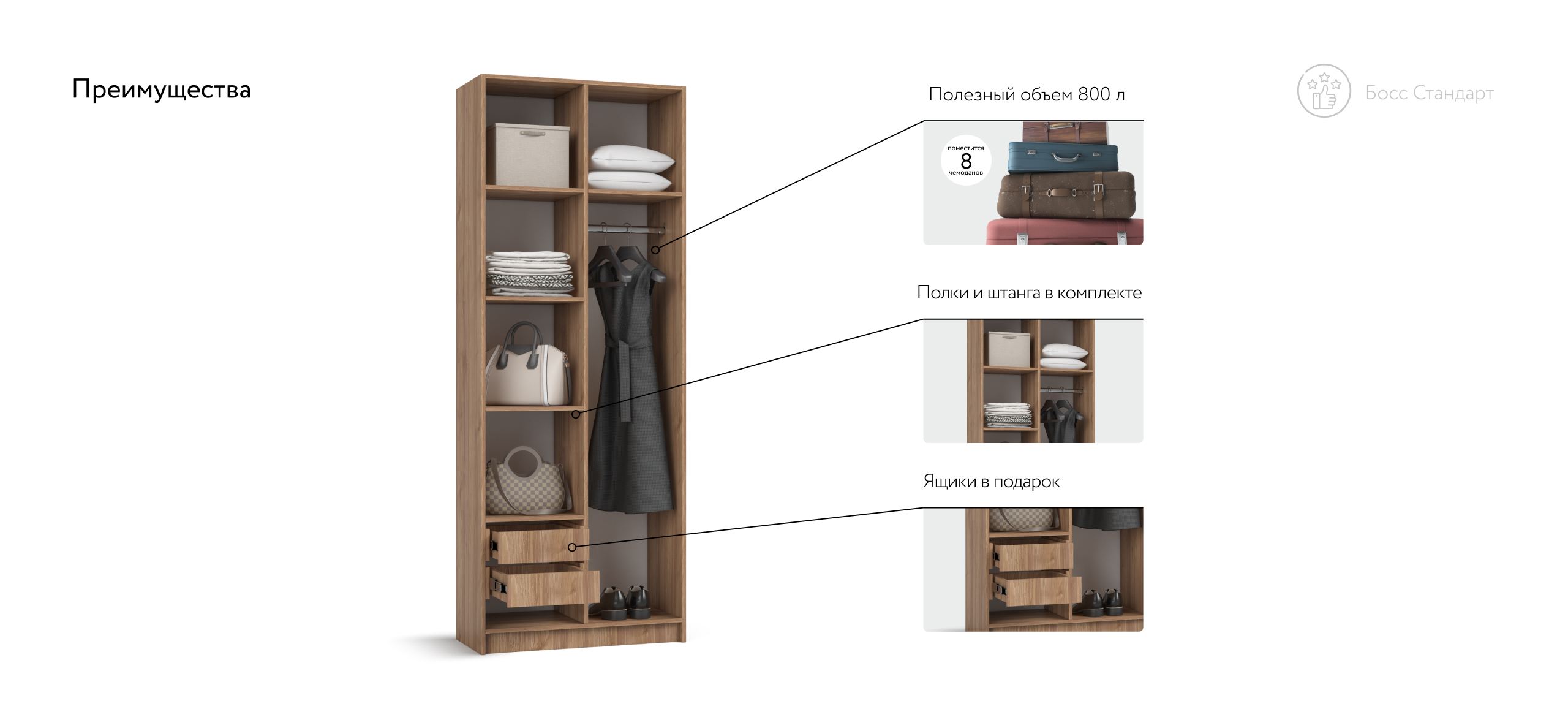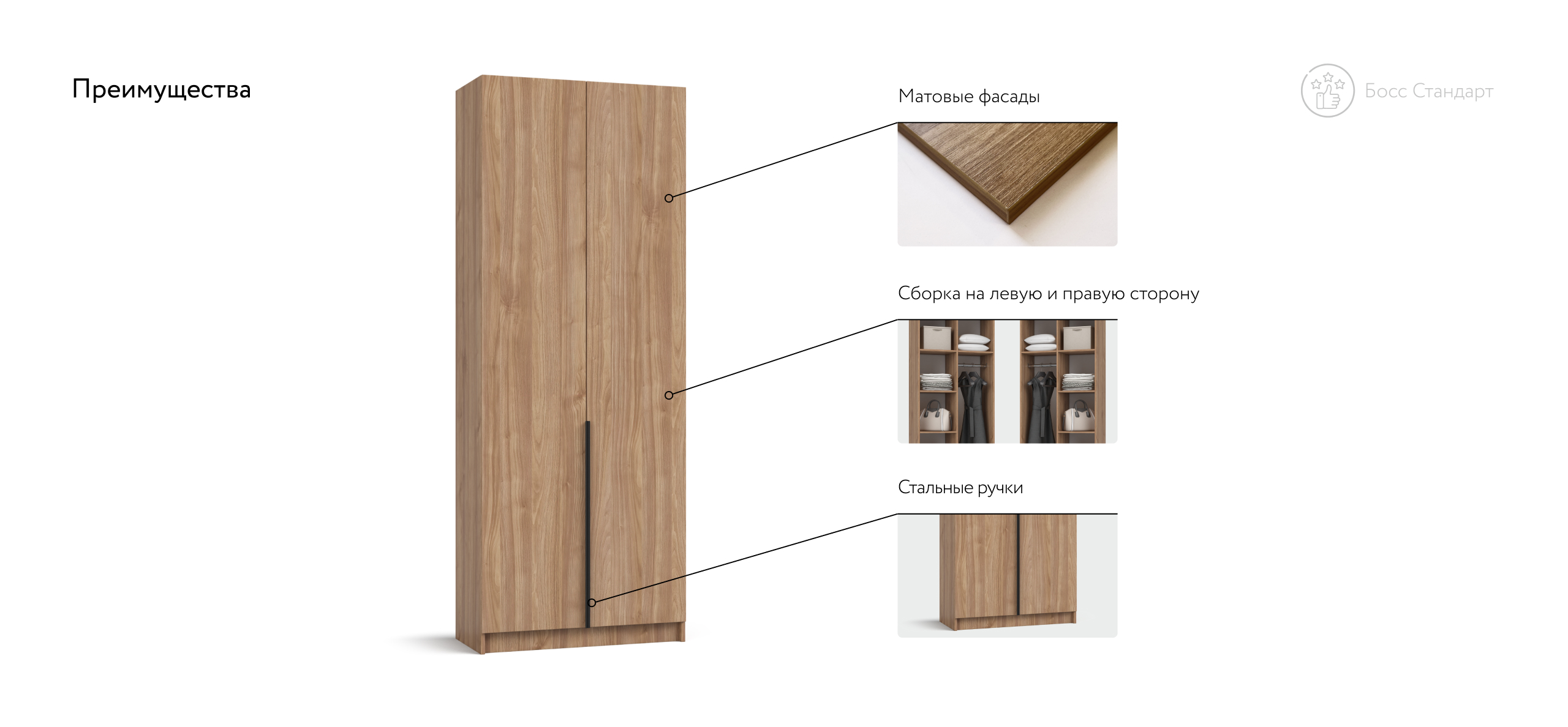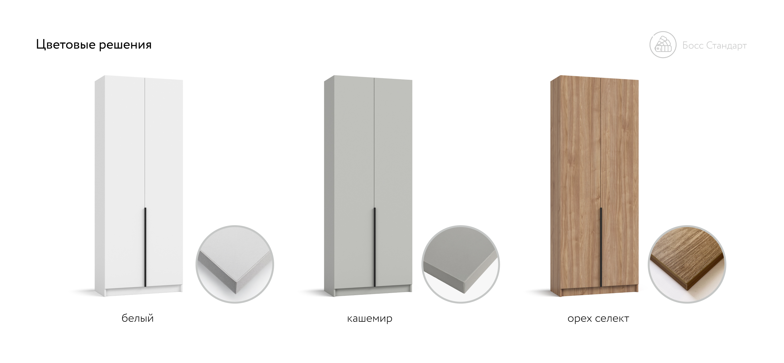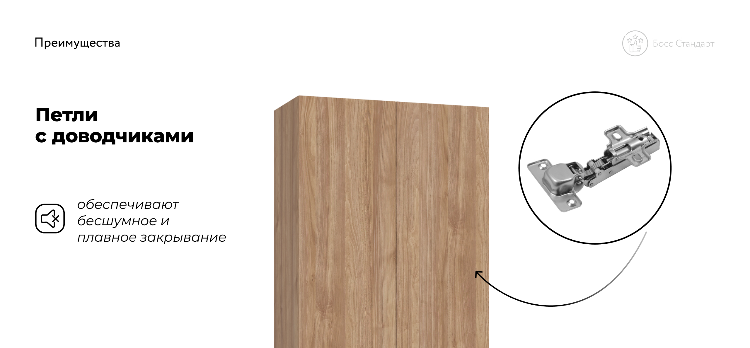Гибкая компоновка превращает Босс Стандарт 80 в персональную систему хранения. Полки и два выдвижных ящика можно расположить справа или слева — выбирайте конфигурацию под планировку и ваши привычки. Двери с премиальными доводчиками открываются лёгким движением и закрываются мягко, поддерживая спокойный ритм утра.