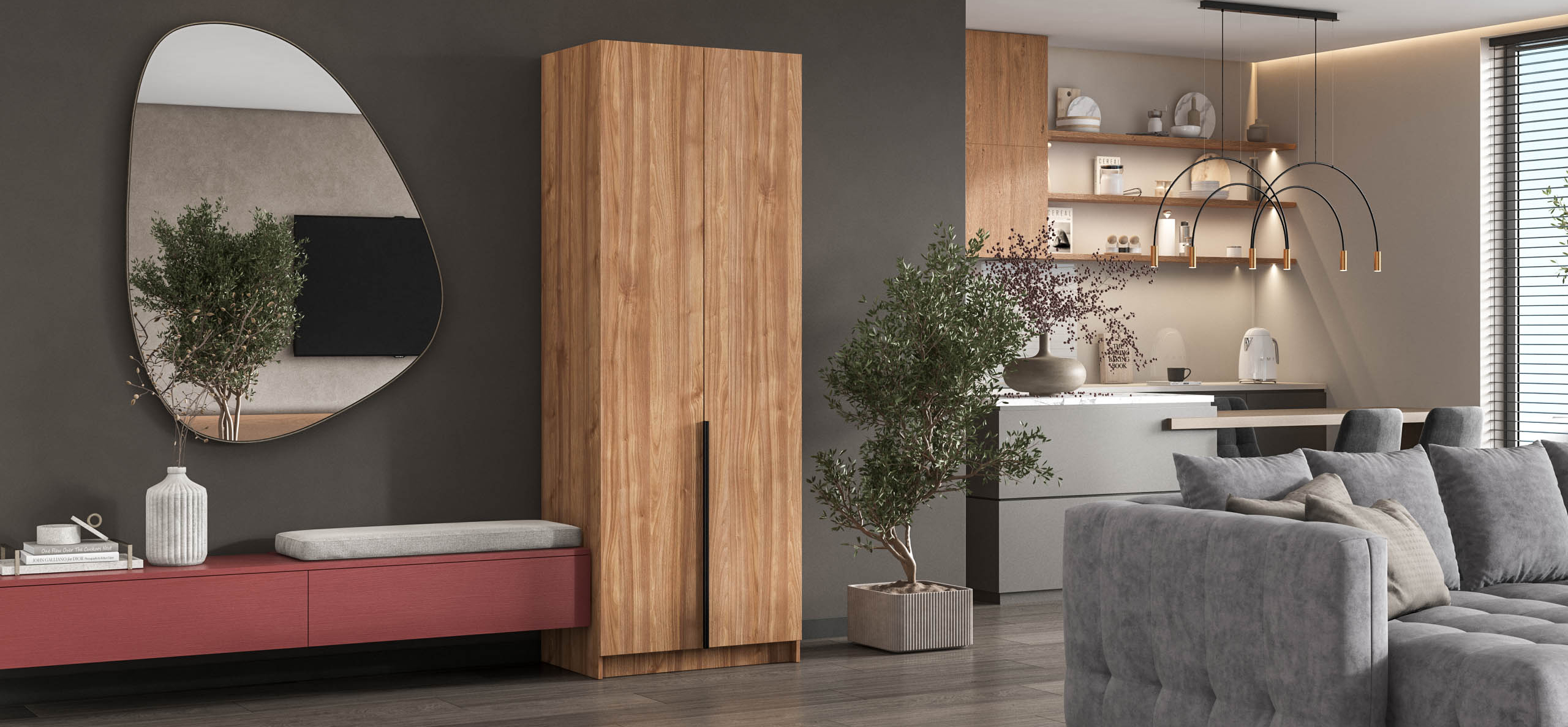 Шкаф Босс Стандарт 80 — компактное, но статусное решение для городской квартиры: хранить всё нужное, оставляя максимум свободного пространства. Лаконичный фасад с удлинёнными чёрными ручками отвечает эстетике 2025 года и становится ярким акцентом любого интерьера — от сканди до неоклассики. Каждый сантиметр внутри задействован: базовый гардероб, коробки с обувью и текстиль размещаются упорядоченно, освобождая комнату от визуального шума.