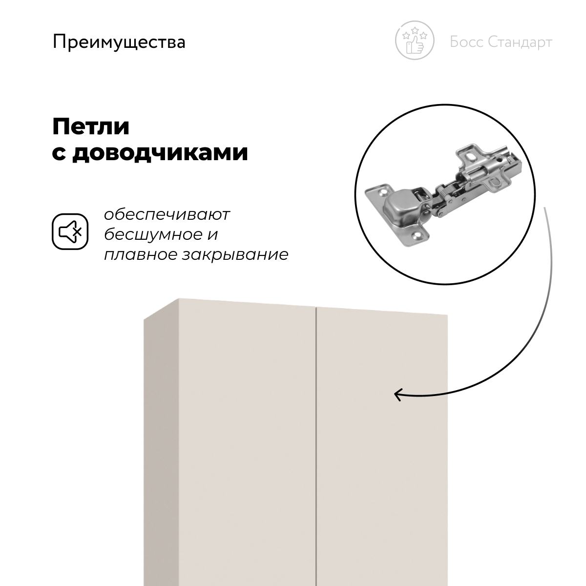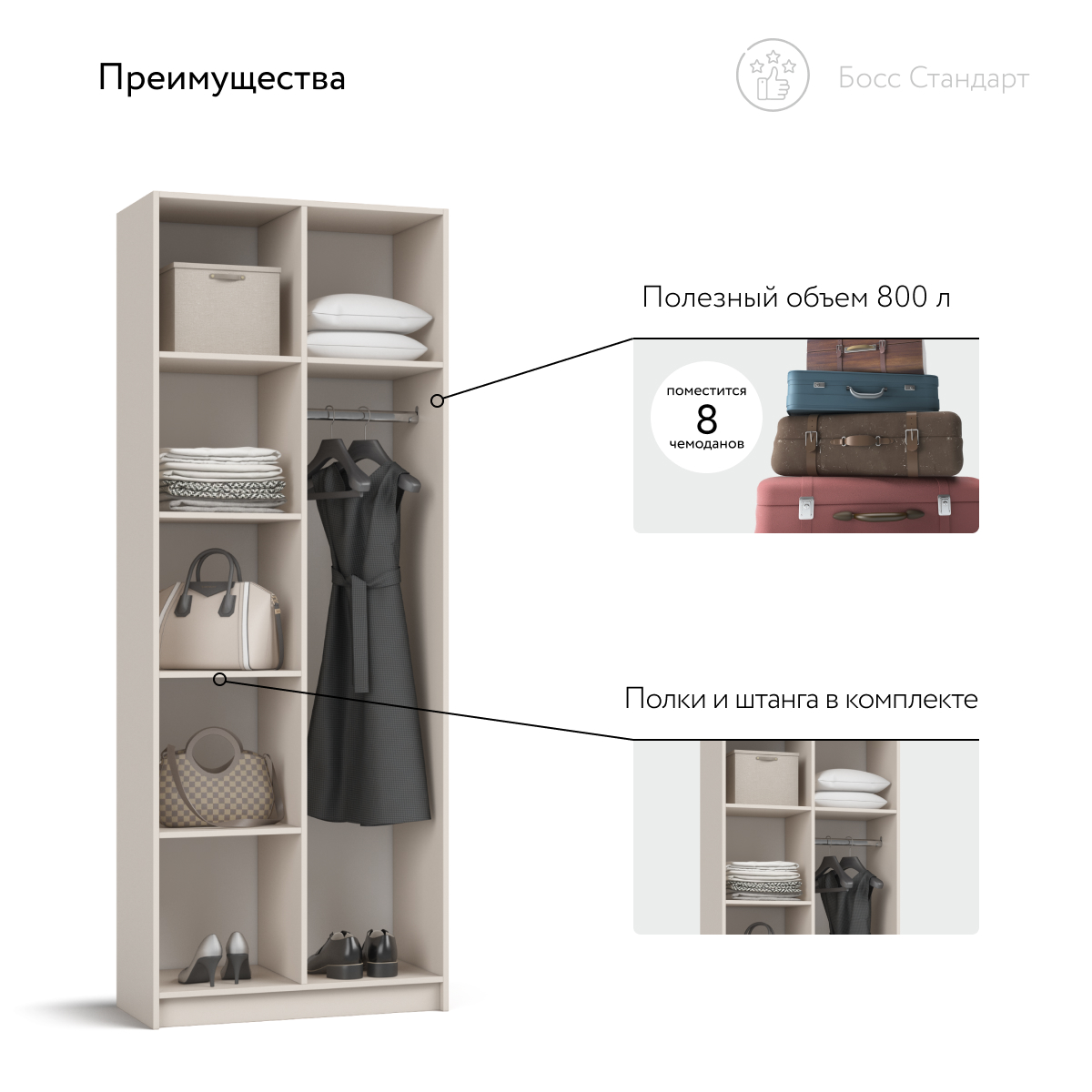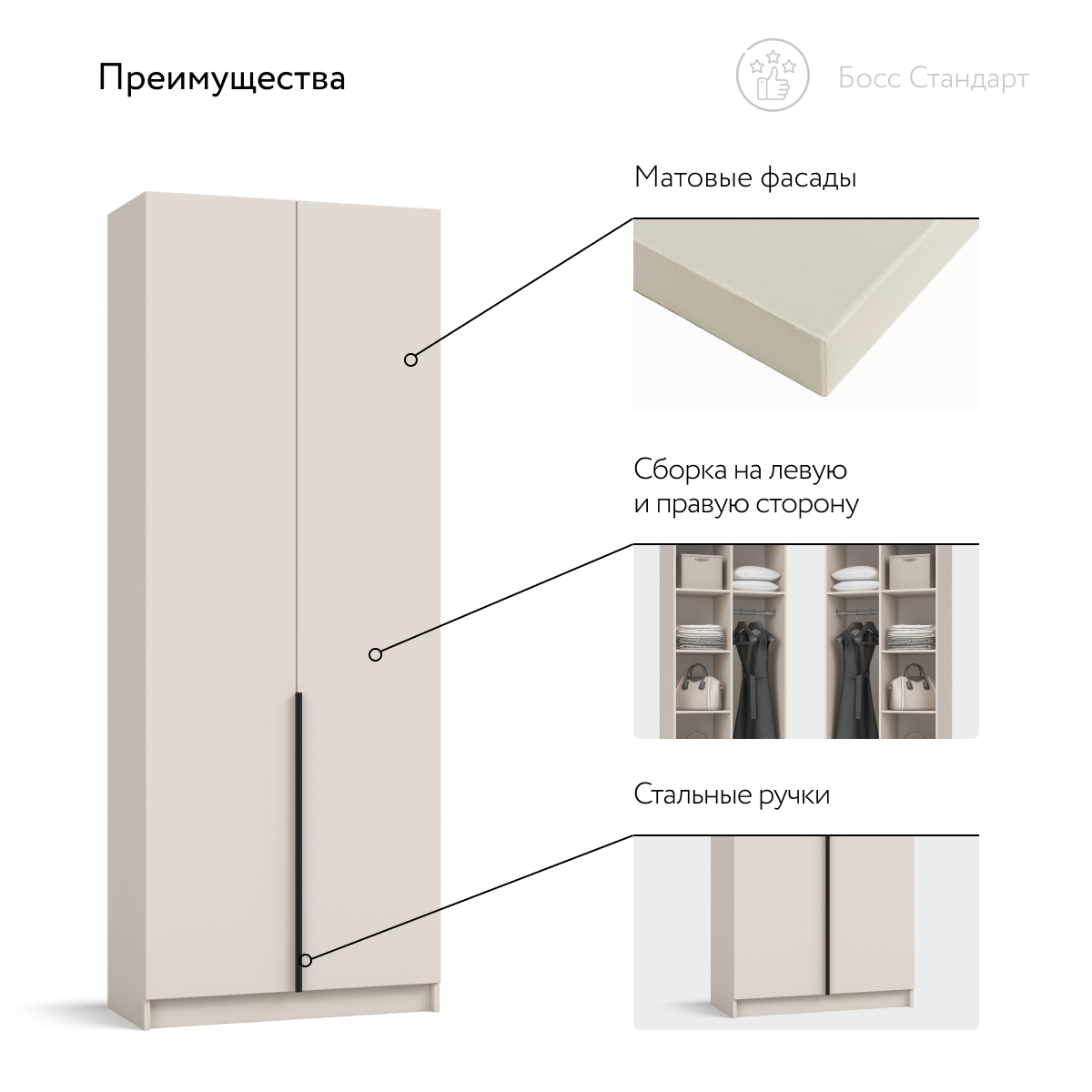 Гибкая компоновка превращает Босс Стандарт 80 в персональную систему хранения. Переставляемые полки позволяют адаптировать внутреннее пространство под высоту одежды и размер коробов, выбирая конфигурацию, которая лучше соответствует планировке комнаты и вашим привычкам. Двери с премиальными доводчиками открываются лёгким движением и закрываются мягко, не нарушая утренний ритм.