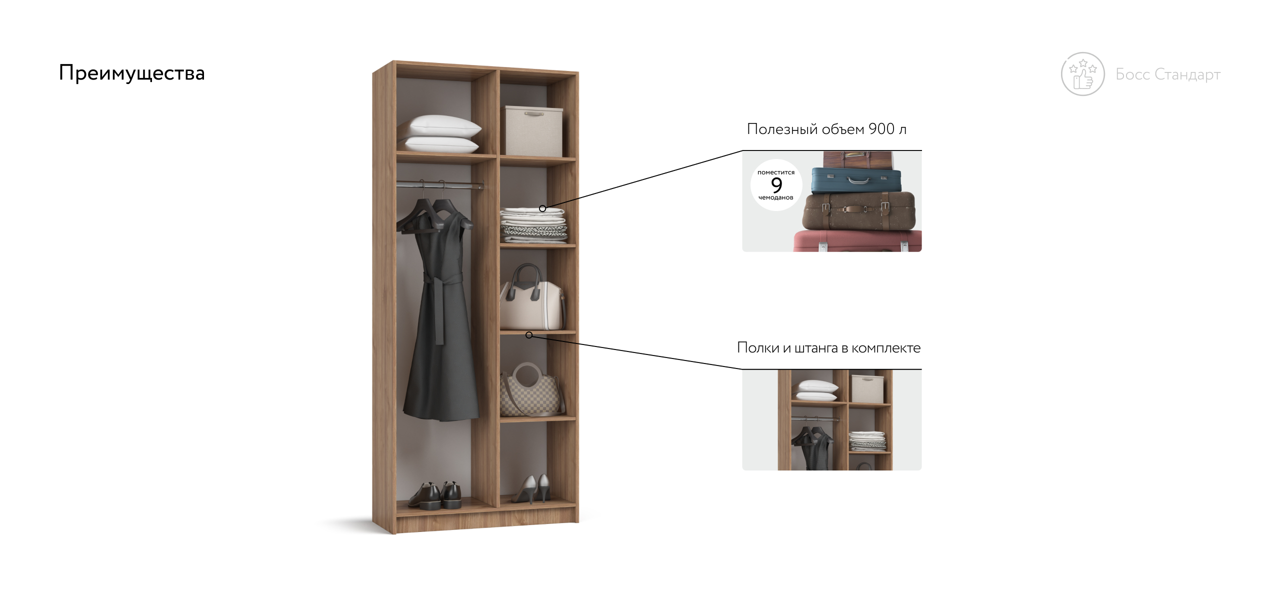 Гибкая компоновка превращает Босс Стандарт 90 в персональную систему хранения. Переставляемые полки можно расположить на нужной высоте — под планировку комнаты и ваши привычки. Двери с премиальными доводчиками открываются лёгким движением и закрываются мягко, не нарушая утренний ритм.