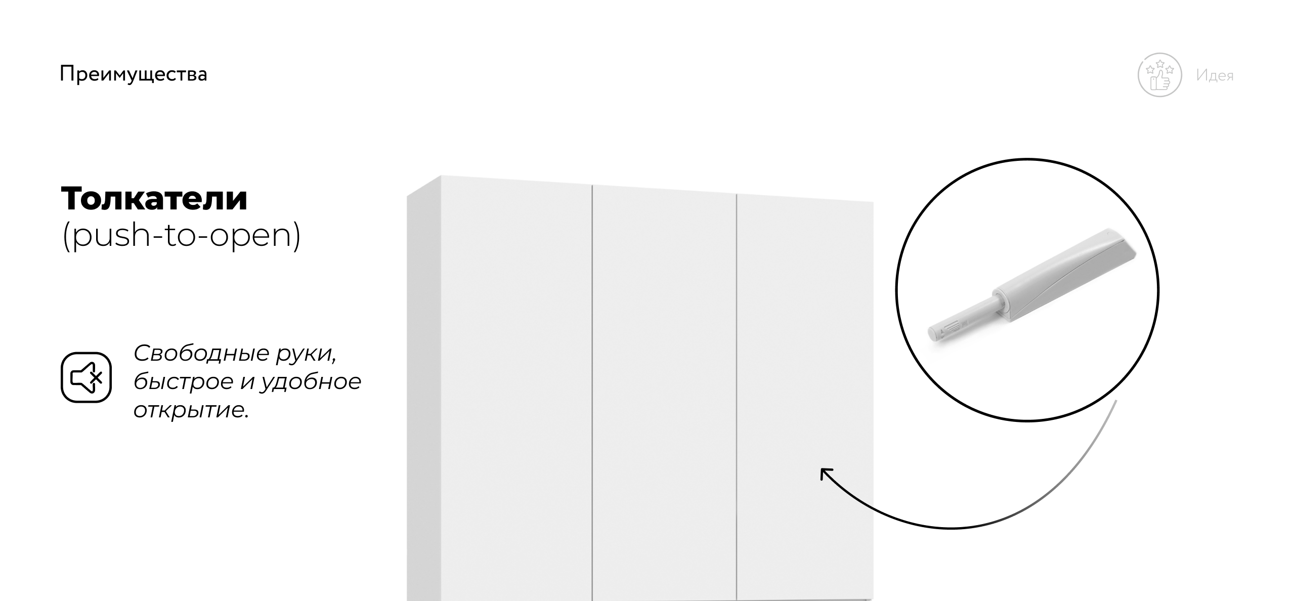 Два оттенка — тёплый Кашемир и светлый Белый — легко встраиваются в сценарии современной квартиры: от спокойного минимализма до мягкой неоклассики. Итог — ощущение упорядоченности и воздуха, когда всё на своём месте и всё под рукой.