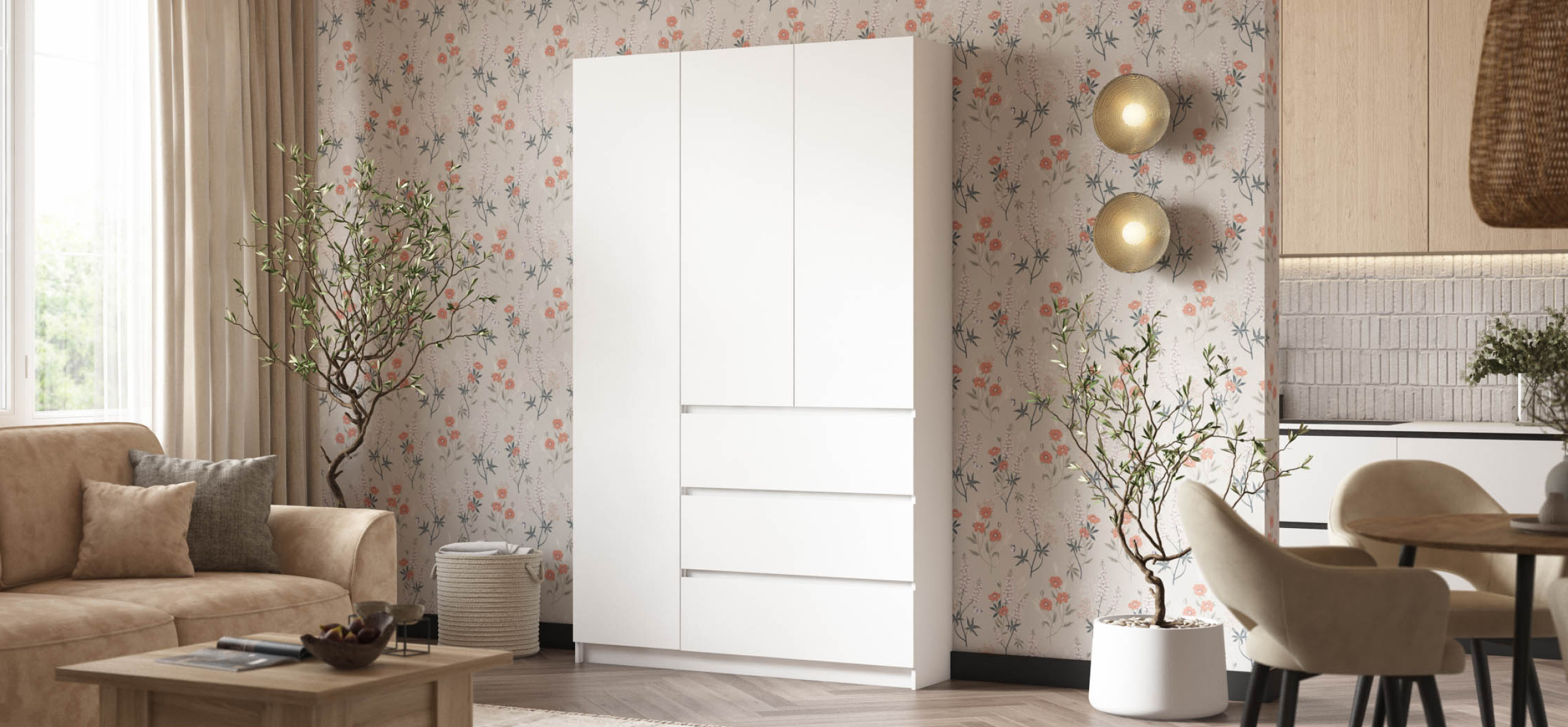 Шкаф становится чётко и ровно на любом покрытии: линии сходятся, зазоры аккуратные, двери ходят тихо и стабильно. Материалы — практичные и безопасные для дома (ЛДСП Е1), кромки аккуратно обработаны, чтобы внешний вид держался годами.
