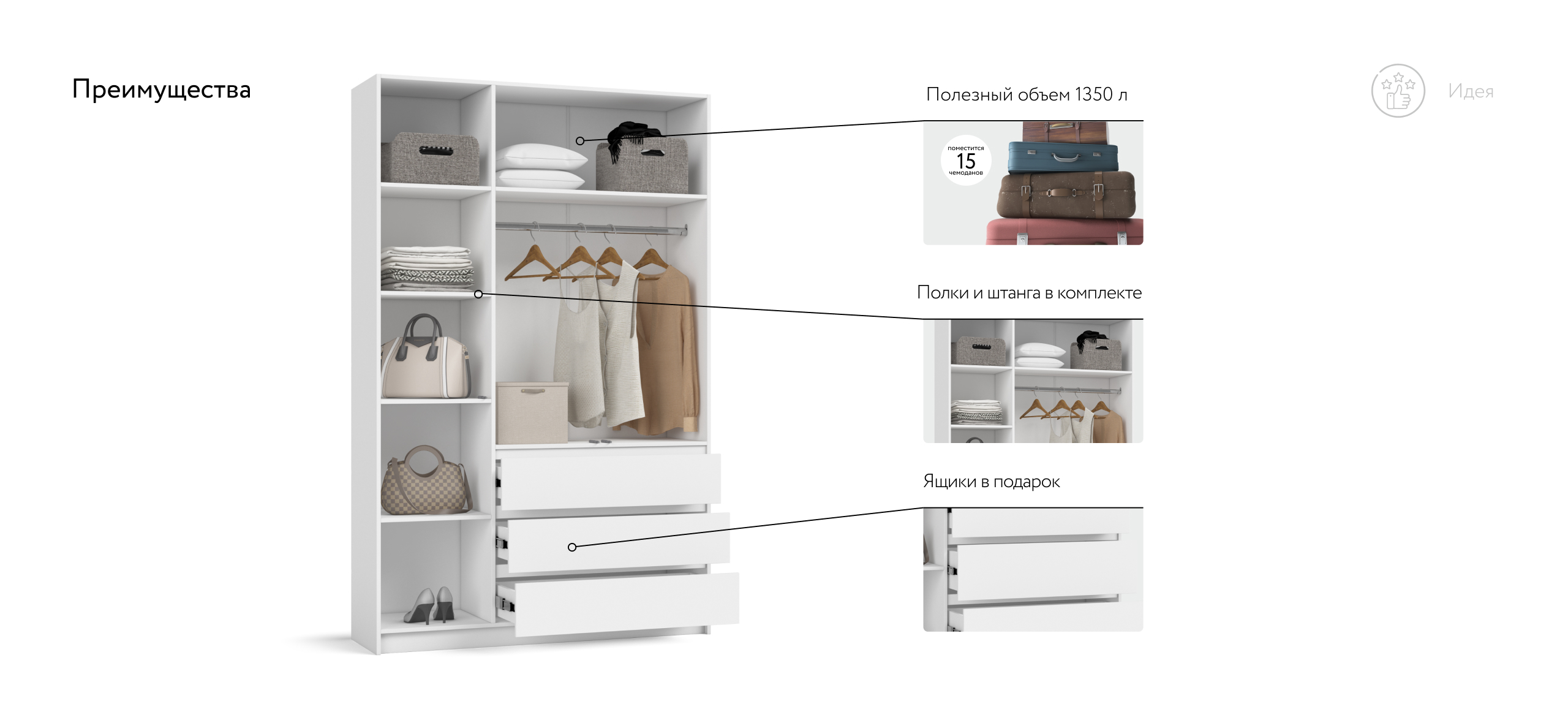 Когда руки заняты — лёгкое касание, и дверь мягко поддаётся. Внутри — ясная логика хранения: блок выдвижных ящиков работает как «мини-комод», помогает быстро разложить бельё и мелочи, а основной объём уверенно берёт на себя содержимое 15 крупных чемоданов — гардероб, обувные коробки, постельное.