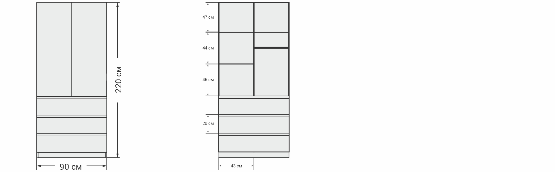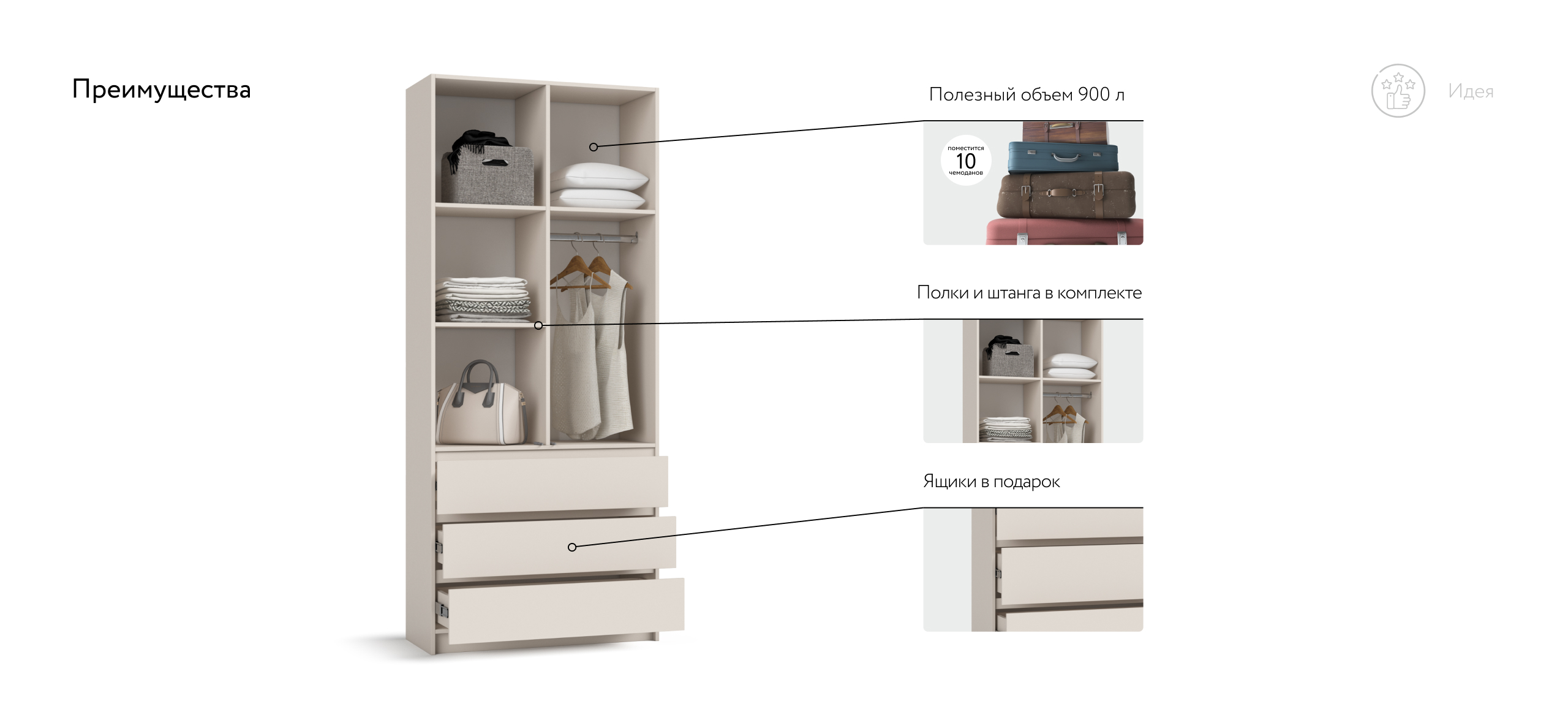 Когда руки заняты — лёгкое касание, и дверь мягко поддаётся. Внутри — ясная логика хранения: блок выдвижных ящиков работает как «мини-комод», помогает быстро разложить бельё и мелочи, а основной объём уверенно берёт на себя содержимое 10 крупных чемоданов — гардероб, обувные коробки, постельное.