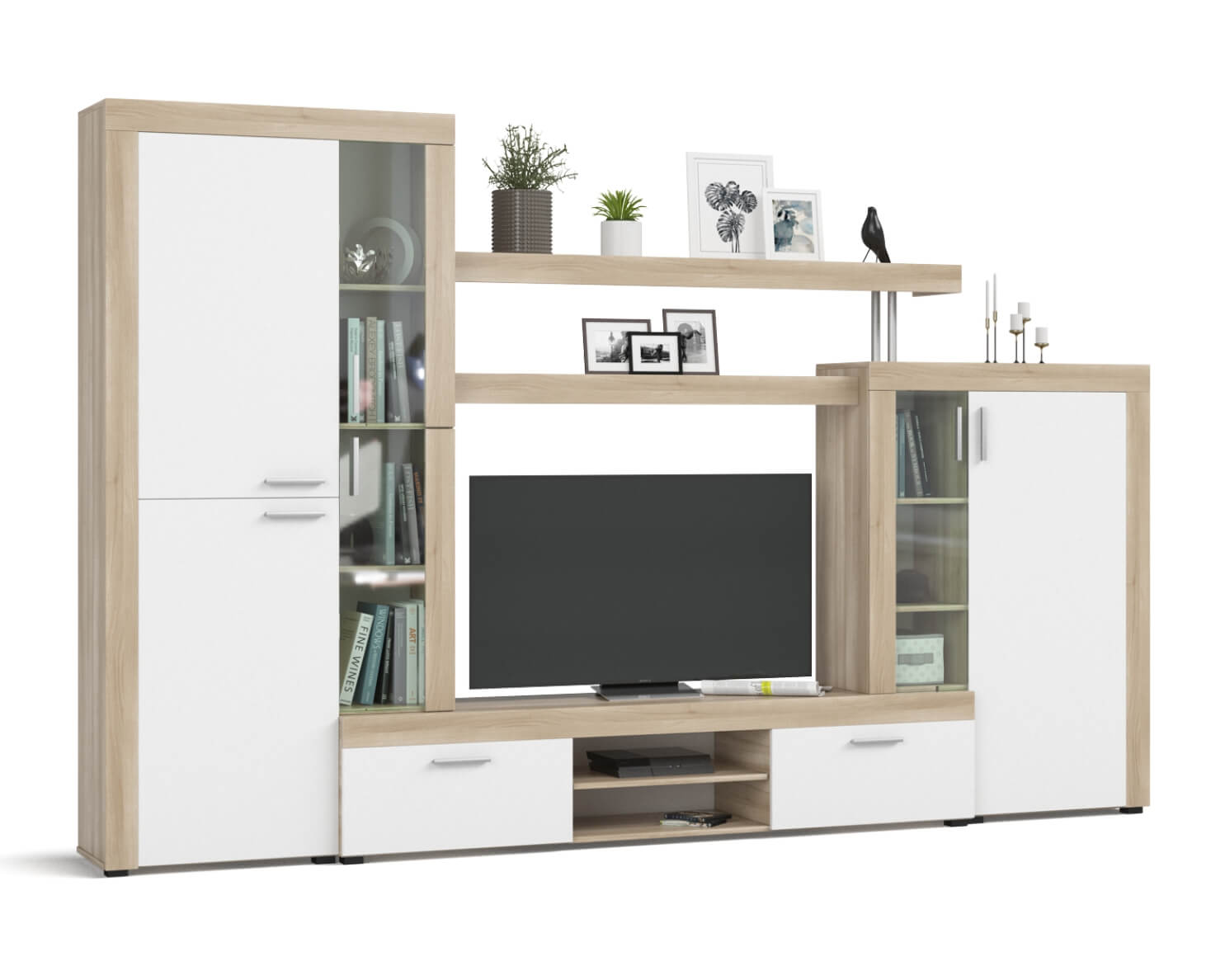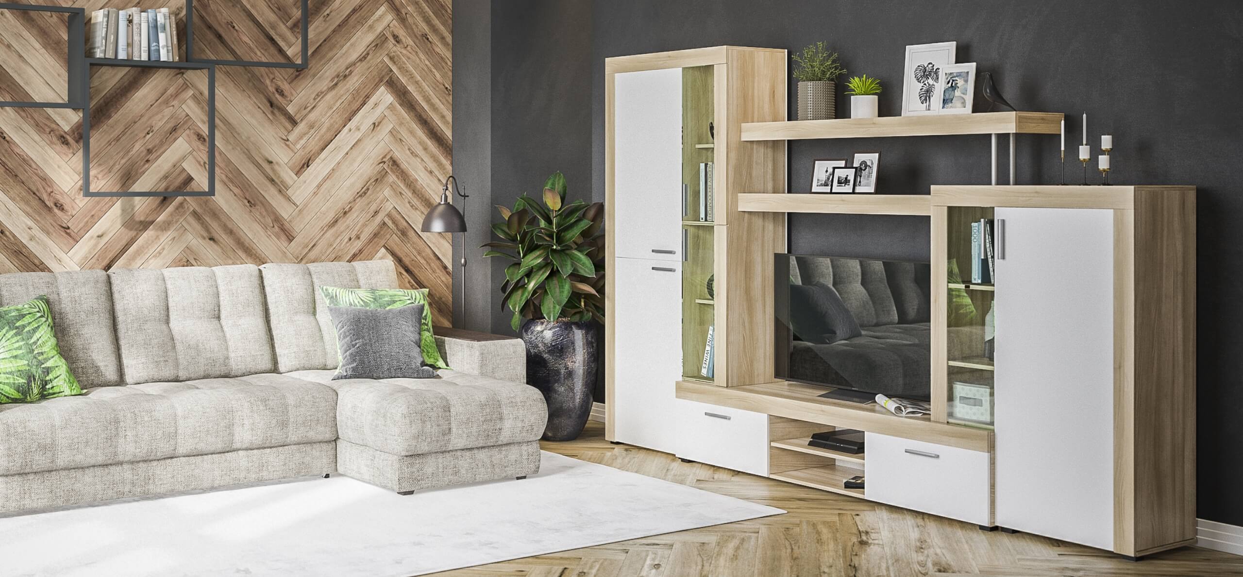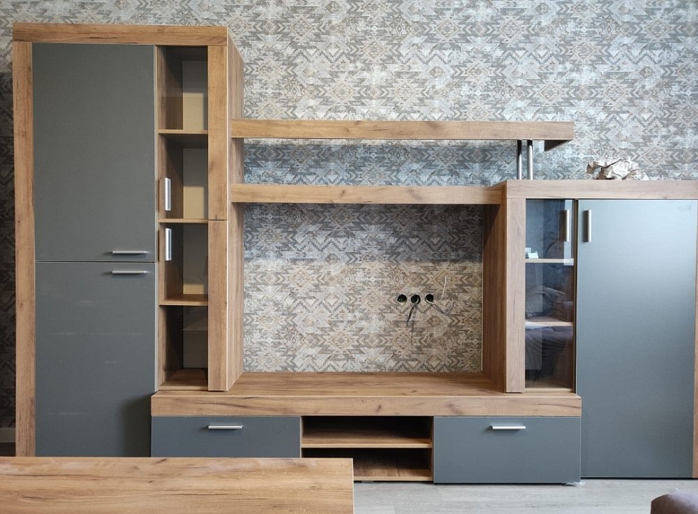 Стенка Монтана – стильная стенка, которая отличается лаконичностью форм и элегантным сочетанием светлых фасадов и корпуса в древесном декоре.